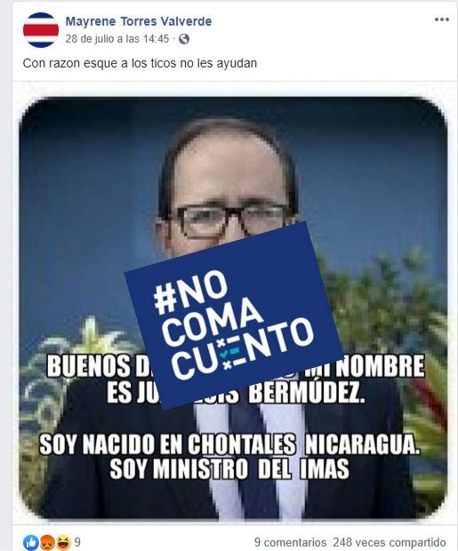 El presidente ejecutivo del Instituto Mixto de Ayuda Social (IMAS), Juan Luis Bermúdez, no nació en el departamento de Chontales, Nicaragua, como asegura una imagen que se comparte, de manera masiva, en Facebook.