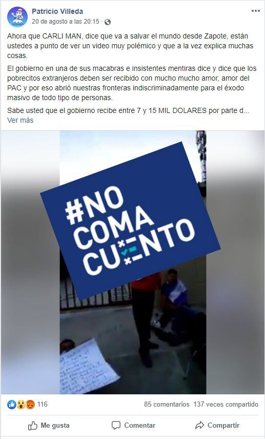 En esta ocasión, la información errónea se empezó a difundir desde un perfil identificado en Facebook como “Patricio Villeda” y viene acompañada de un video en el que se escucha a personas, supuestamente de nacionalidad nicaragüense, reclamando por las condiciones en que viven en territorio nacional.