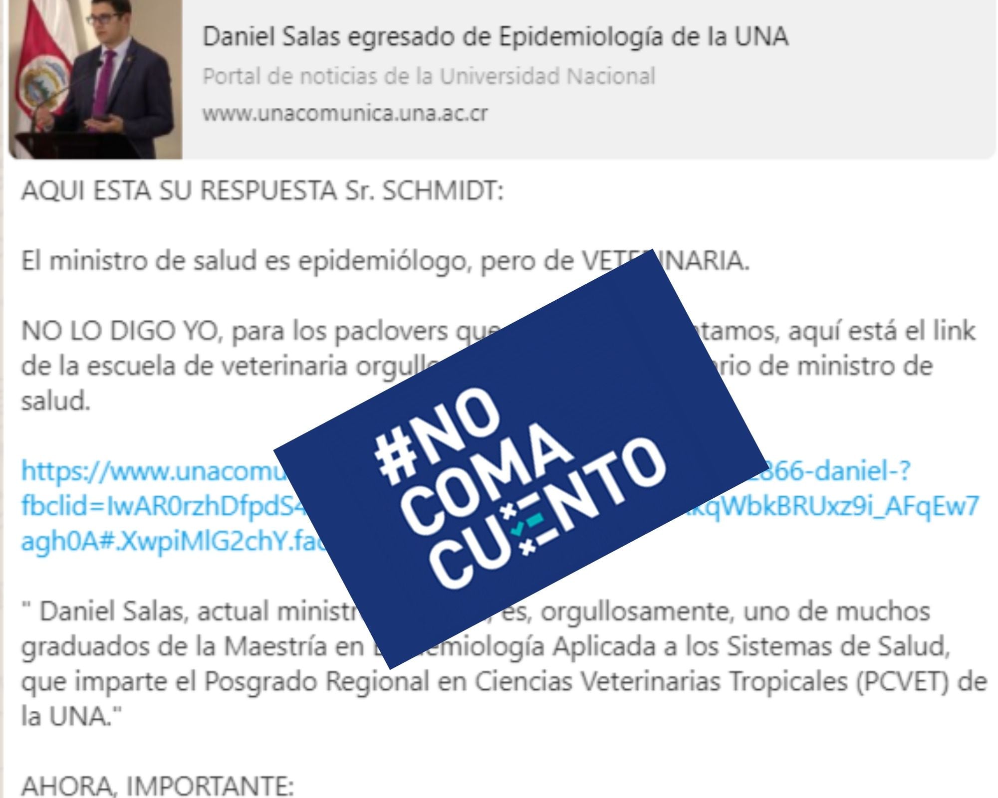 Varias publicaciones que circulan en WhatsApp y Facebook desinforman sobre la preparación profesional del ministro de Salud, Daniel Salas, por el hecho de haber cursado su maestría en Epidemiología en la Escuela de Medicina Veterinaria de la Universidad Nacional (UNA).