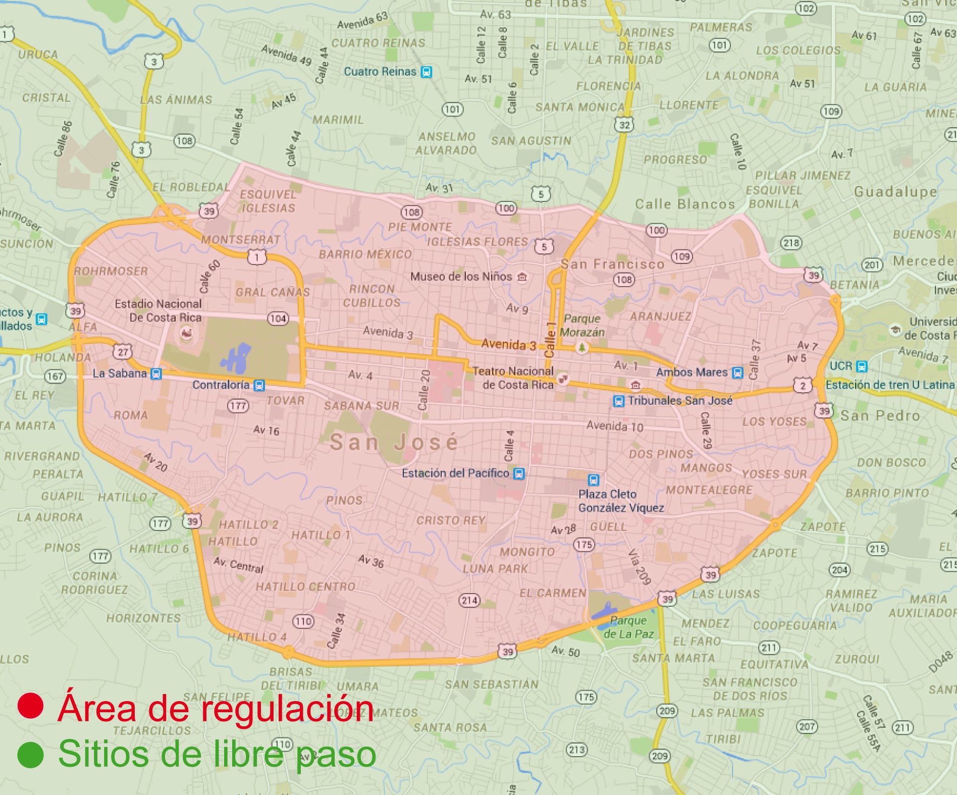 La prohibición solo se aplica dentro del área conformada por el bulevar de Circunvalación (ruta 39), la radial La Uruca (ruta 108) y la carretera La Uruca-Calle Blancos (ruta 100).