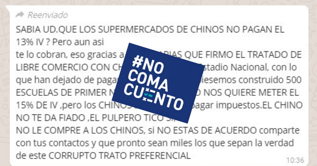 Un mensaje que se difunde de forma masiva en WhatsApp asegura, de manera errónea, que los productos comercializados por los supermercados de chinos, no pagan el 13% del impuesto de ventas.