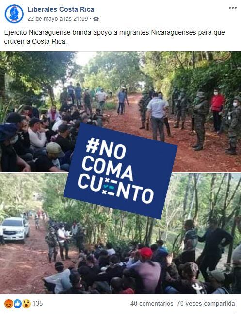 “Ejército nicaragüense brinda apoyo a migrantes nicaragüenses para que crucen a Costa Rica”, dice la información errónea publicada por la página de Facebook.