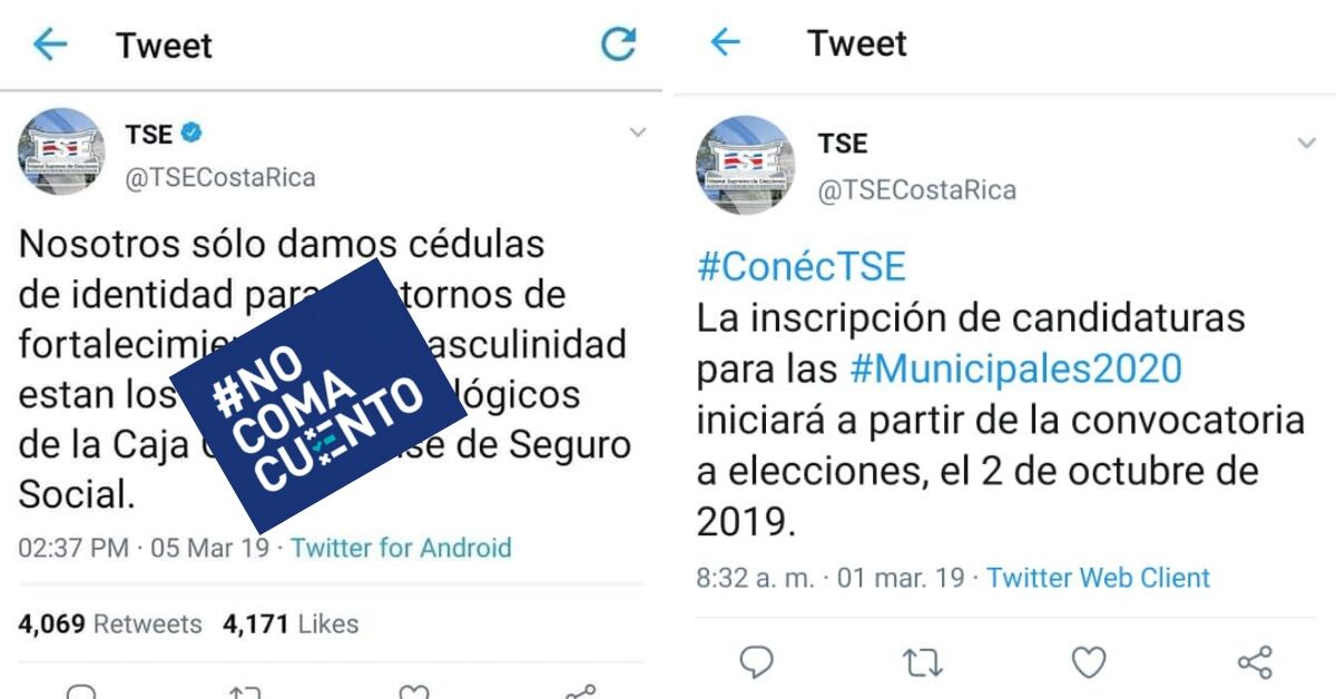 El montaje se hace pasar por la cuenta oficial del ente electoral en Twitter @TSECostaRica. Sin embargo, comete el error de incluir un check azul junto al nombre de perfil, identificador de autenticidad con que no cuenta el TSE en esa red social.