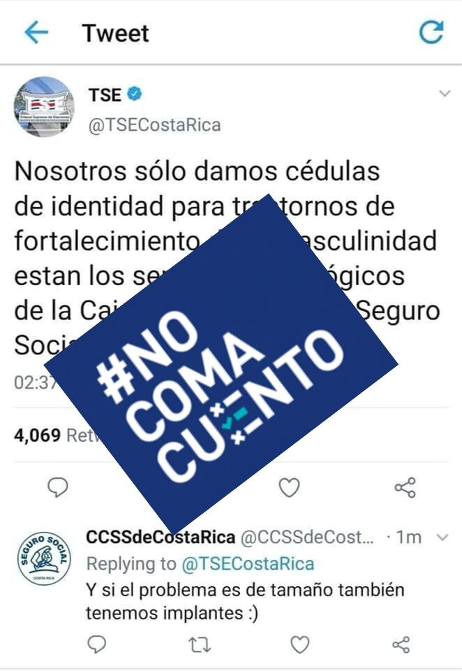 La publicación falsa dice: “Nosotros solo damos cédulas de identidad, para trastornos de fortalecimiento de la masculinidad están los servicios psicológicos de la Caja Costarricense de Seguro Social".