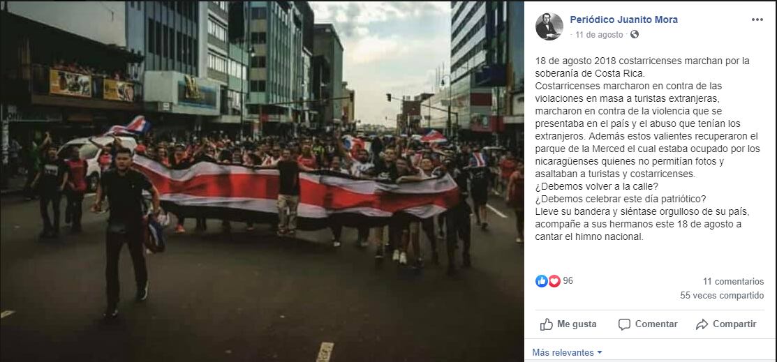 Algunos de los portales también reivindican las agresiones que se dieron el 18 de agosto del año anterior. Por ejemplo, el 11 de agosto, la página denominada ‘Periódico Juanito Mora’ publicó: “Costarricenses marcharon en contra de las violaciones en masa a turistas extranjeras, marcharon en contra de la violencia que se presentaba en el país y el abuso que tenían los extranjeros. Además, estos valientes recuperaron el parque de La Merced, el cual estaba ocupada por los nicaragüenses, quienes no permitían fotos y asaltaban a turistas y costarricenses".