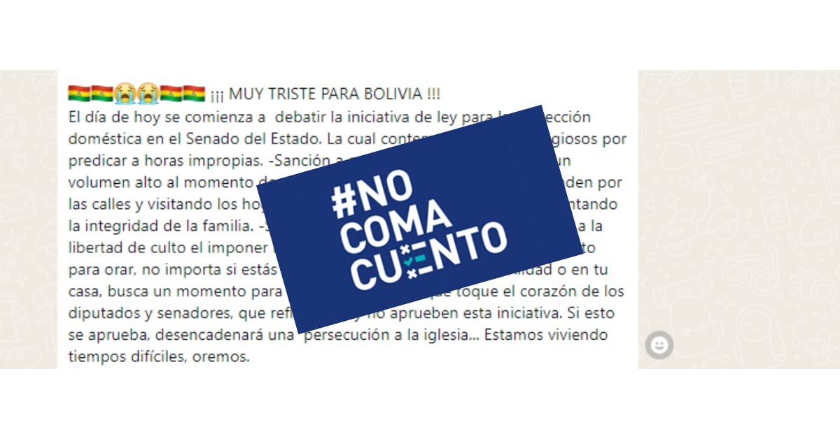 La cadena, que se comparte en chats de usuarios costarricenses, dice: “¡¡¡ MUY TRISTE PARA BOLIVIA !!!El día de hoy se comienza a debatir la iniciativa de ley para la protección doméstica en el Senado del Estado. La cual contempla -Cárcel a religiosos por predicar a horas impropias. -Sanción a congregaciones que tengan un volumen alto al momento de celebrar su culto” (SIC).