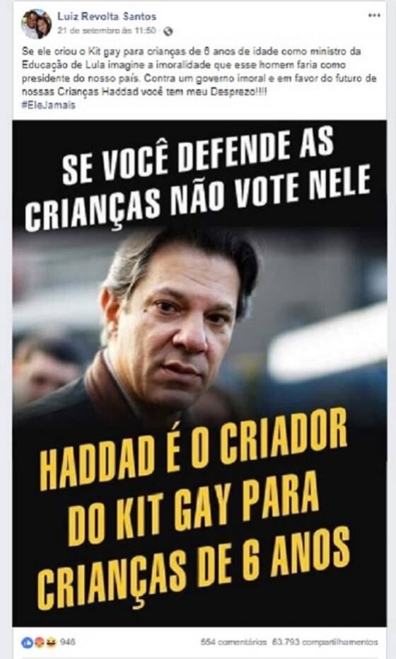 O bien, envían mensajes en los que se asegura que Haddad distribuyó un “kit gay” para niños menores de seis años, cuando fue ministro de Educación. En realidad él lo que promovió fue un programa llamado “Escuela sin homofobia”, que buscaba formar a los profesores en temas como el respeto a la diversidad. Sin embargo, la iniciativa nunca vio la luz por presión de los diputados evangélicos del parlamento brasileño.