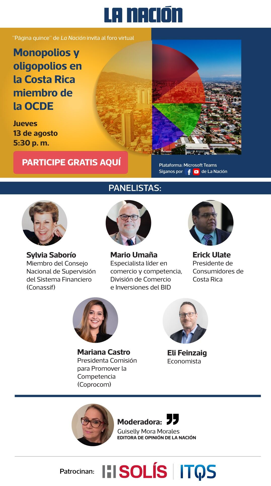Acerca de estos temas disertará este jueves 13 de agosto, a las 5:30 p. m., un panel de expertos en la materia, compuesto por Erick Ulate Quesada, presidente de Consumidores de Costa Rica; Mario Umaña Vargas, especialista líder en comercio y competencia de la División de Comercio e Inversiones del BID; Mariana Castro Sotela, presidenta de la Comisión para Promover la Competencia (Coprocom); Sylvia Saborío Alvarado, miembro del Consejo Nacional de Supervisión del Sistema Financiero (Conassif); y el economista Eli Feinzaig.