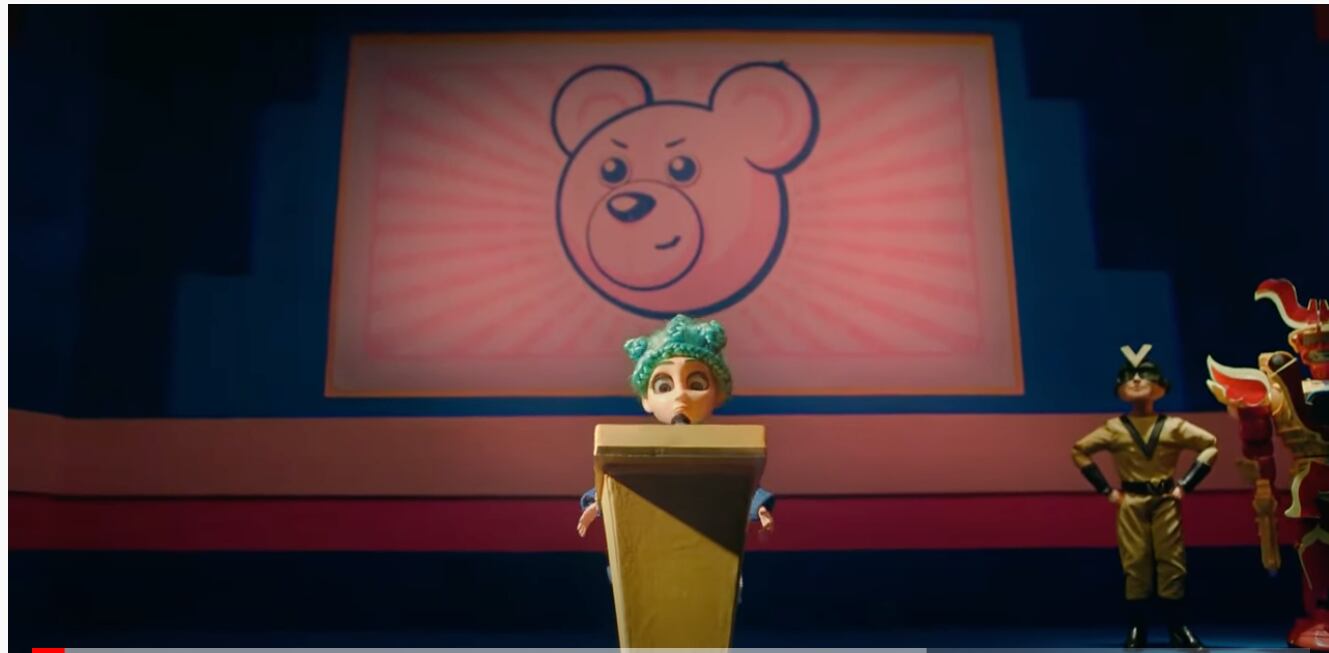 Por cierto, en el video, una asamblea de juguetes aparece bajo un enorme retrato del oso, copia casi exacta de carteles de la Revolución Cultural china que mostraban a Mao Zedong como un sol radiante: traición del subconsciente. Volvamos a la “huelga”.