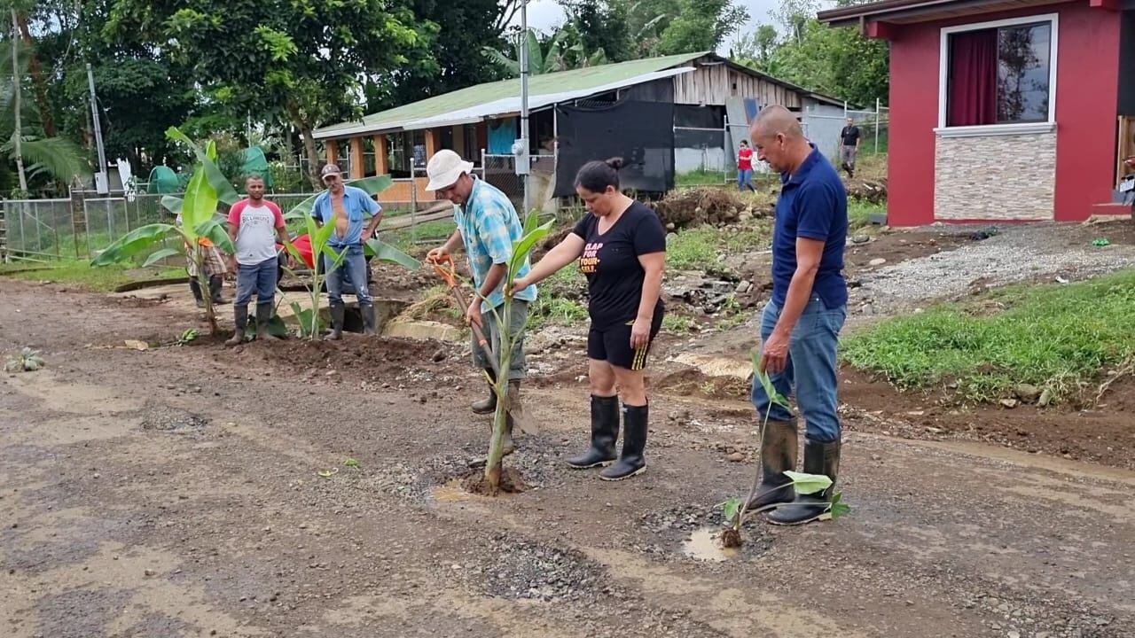 Los vecinos de la calle Jeremías, en Aguas Zarcas de San Carlos, decidieron “sembrar” matas de plátano en los enormes huecos a lo largo de dos kilómetros de la calle cantonal que atraviesa la comunidad. Es un intento desesperado por llamar la atención de la Municipalidad de San Carlos sobre el mal estado de la vía, luego de tres años sin recibir mantenimiento.