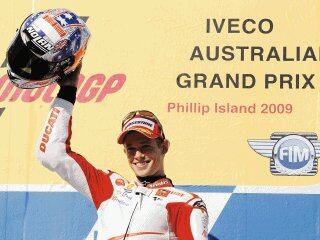 Phillip Island, Australia (AFP). El australiano Casey Stoner (Ducati) se llevó este domingo el Gran Premio de Australia de Moto GP al superar al italiano Rossi (Yamaha) y al español Pedrosa (Honda), mientras que el español Julián Simón se impuso en 125 cc y se coronó campeón del mundo.