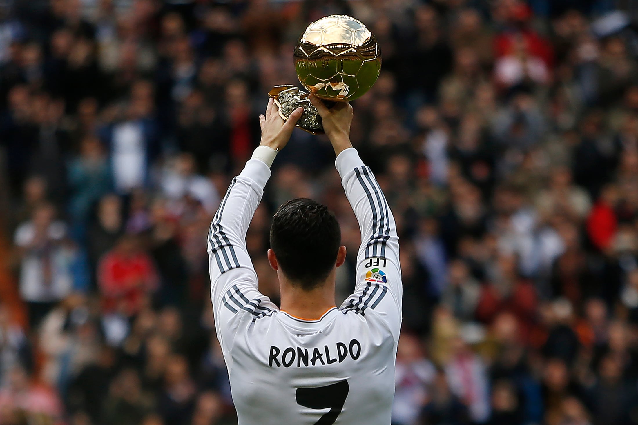 Ronaldo mostró el Balón de Oro 2013 desde el círculo central, mientras el público le ovacionaba y un grupo de aficionados mostraba una pancarta que decía 'Cristiano, el más grande'.