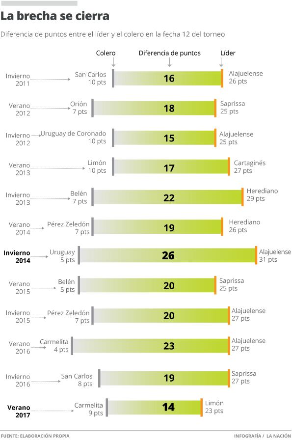 Curiosamente, el torneo de mayor distancia entre el primero y el último puesto también tuvo a los mismos protagonistas: Alajuelense y Uruguay de Coronado. En el Invierno 2014, los manudos lideraban la tabla con 31 unidades, y en la parte baja se ubicaban los lecheros con solamente 5, lo que significaba una diferencia de 26.