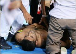 Poco después el kinesoterapeuta del equipo francés declaró a la AFP que la herida no afectaba ni a la pelura ni al hígado. "Tiene dolor pero está bien. La jabalina se encajó en el gran dorsal, el músculo lateral del tórax. Le han hecho una radiografía torácica y han visto que la pleura no fue alcanzada", declaró Marc Michnowski.