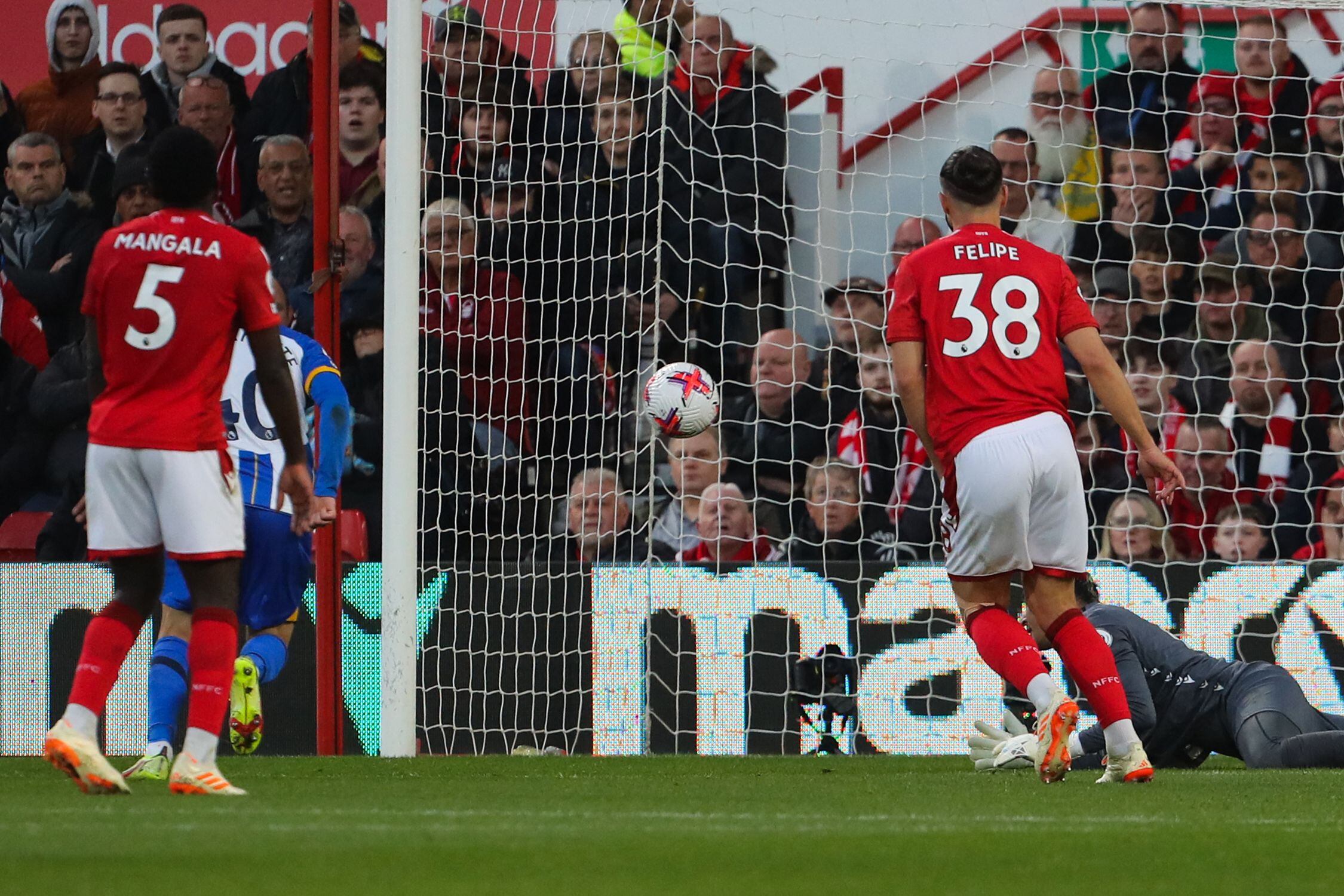 Con esta acción, el Brighton le está ganando 1 a 0 al Nottingham Forest.