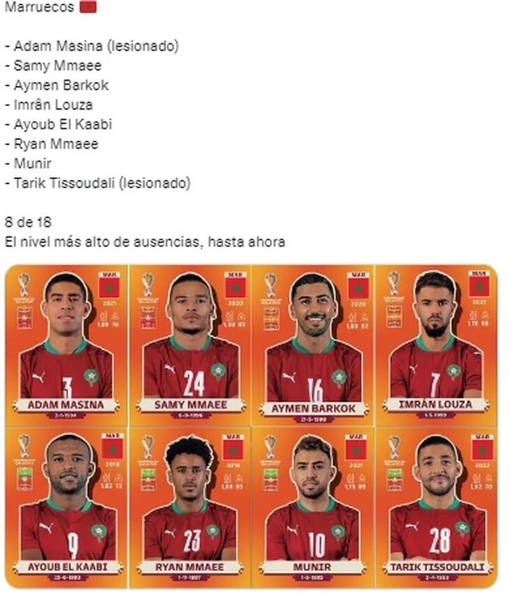 Marruecos y Ghana son los equipos con más figuras en el álbum que no van a la Copa del Mundo. De Marruecos no van 8, el 44.4% de sus postales, y de Ghana son siete los ausentes para el Mundial, el 38.9%.