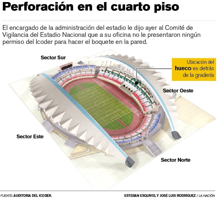 “Julián Ramírez, quien está al frente de la administración del Estadio, me dijo que ayer (jueves) a las 4:10 p. m. Luis Miguel Herrero le dijo del hueco, pero que cuando él (Ramírez) llegó al lugar ya el hueco estaba hecho... él se hizo acompañar de Luis Cerdas, jefe de mantenimiento de la administración; él (Ramírez) me indicó que no tiene ninguna autorización por escrito –dada por Herrero–”, añadió.