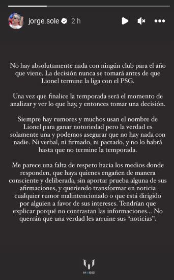 “No hay absolutamente nada con ningún club para el año que viene. La decisión nunca se tomará antes de que Lionel termine la liga con el PSG”, escribió Jorge Messi en su cuenta oficial de Instagram.