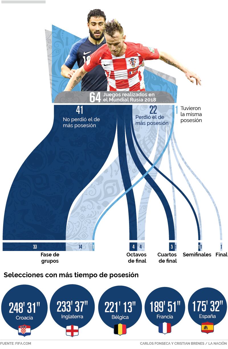 Para detallar lo que ocurrió en cada fase, La Nación analizó lo hecho por cada equipo. En 33 de 48 choques de esta ronda no salió derrotado quien conquistó el balón, en 14 pasó lo contrario y en uno tuvieron el mismo porcentaje (Costa Rica-Serbia).