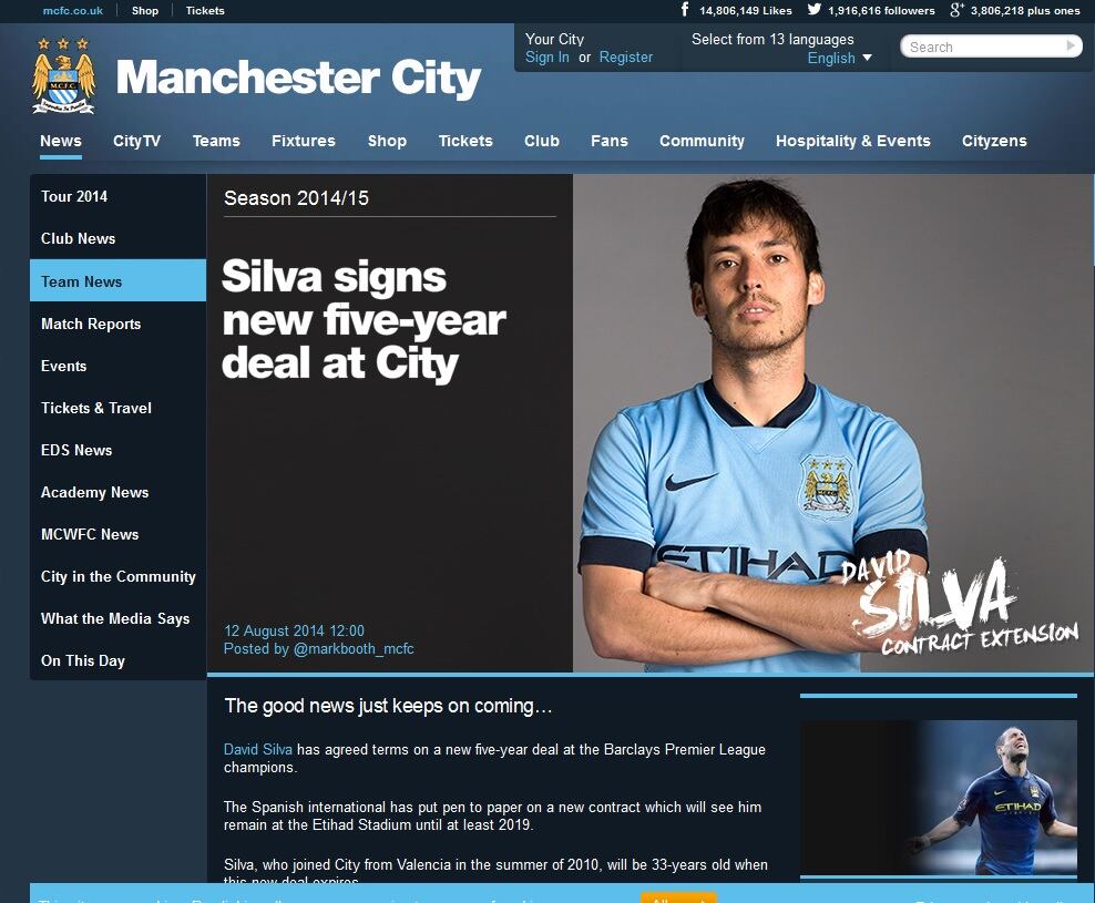 "Desde que llegué al club hace cuatro años ha sido como una segunda casa para mí", afirmó Silva, que también ganó la FA Cup (2011) y la Copa de la Liga con el City (2014), a la página web del club.