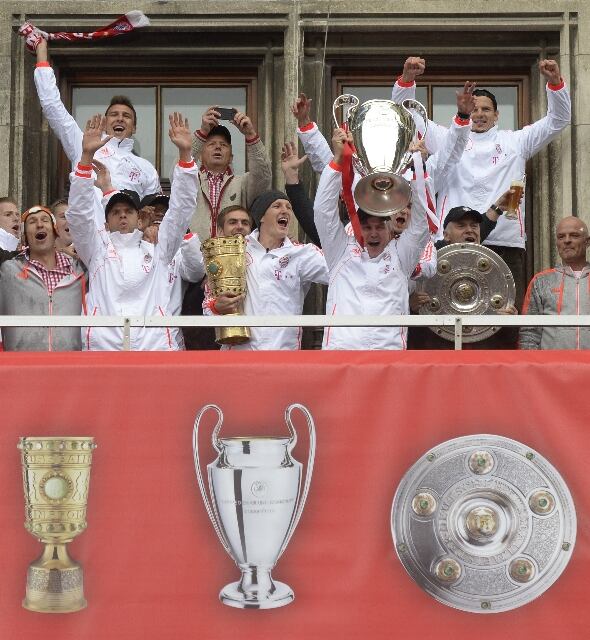 Instalados en el balcón del Ayuntamiento de la capital bávara, los jugadores presentaron a sus muchos aficionados reunidos en la Marienplatz, pese al frío y la lluvia desde horas antes, los tres trofeos ganados en una temporada excepcional para el club más laureado de Alemania.