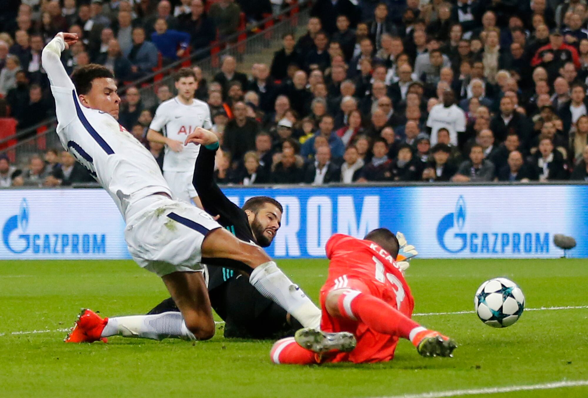 El primer aviso serio llegó con un centro de Trippier, quien envió una buena pelota que la zaga merengue dejó pasar, pero para su suerte ningún jugador del Tottenham apareció, en el 13′.