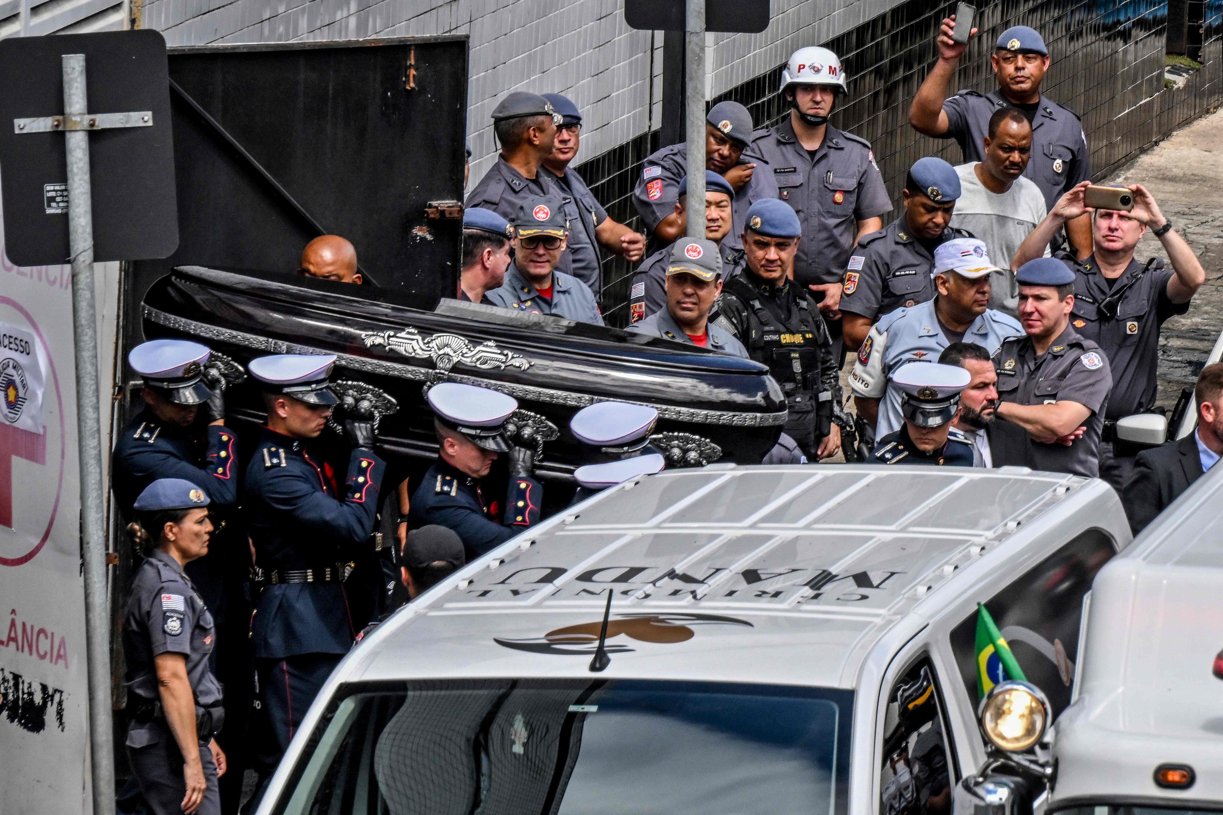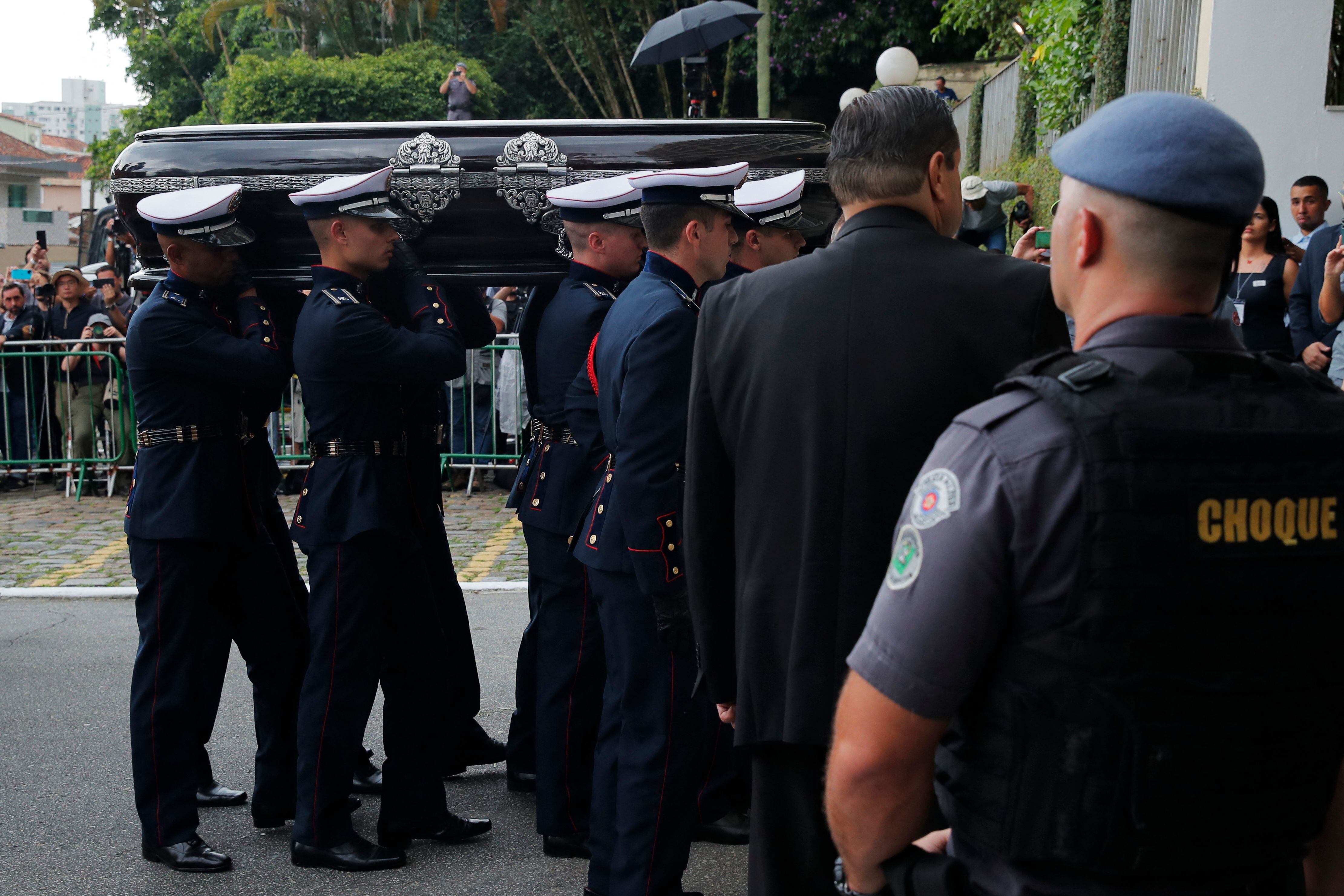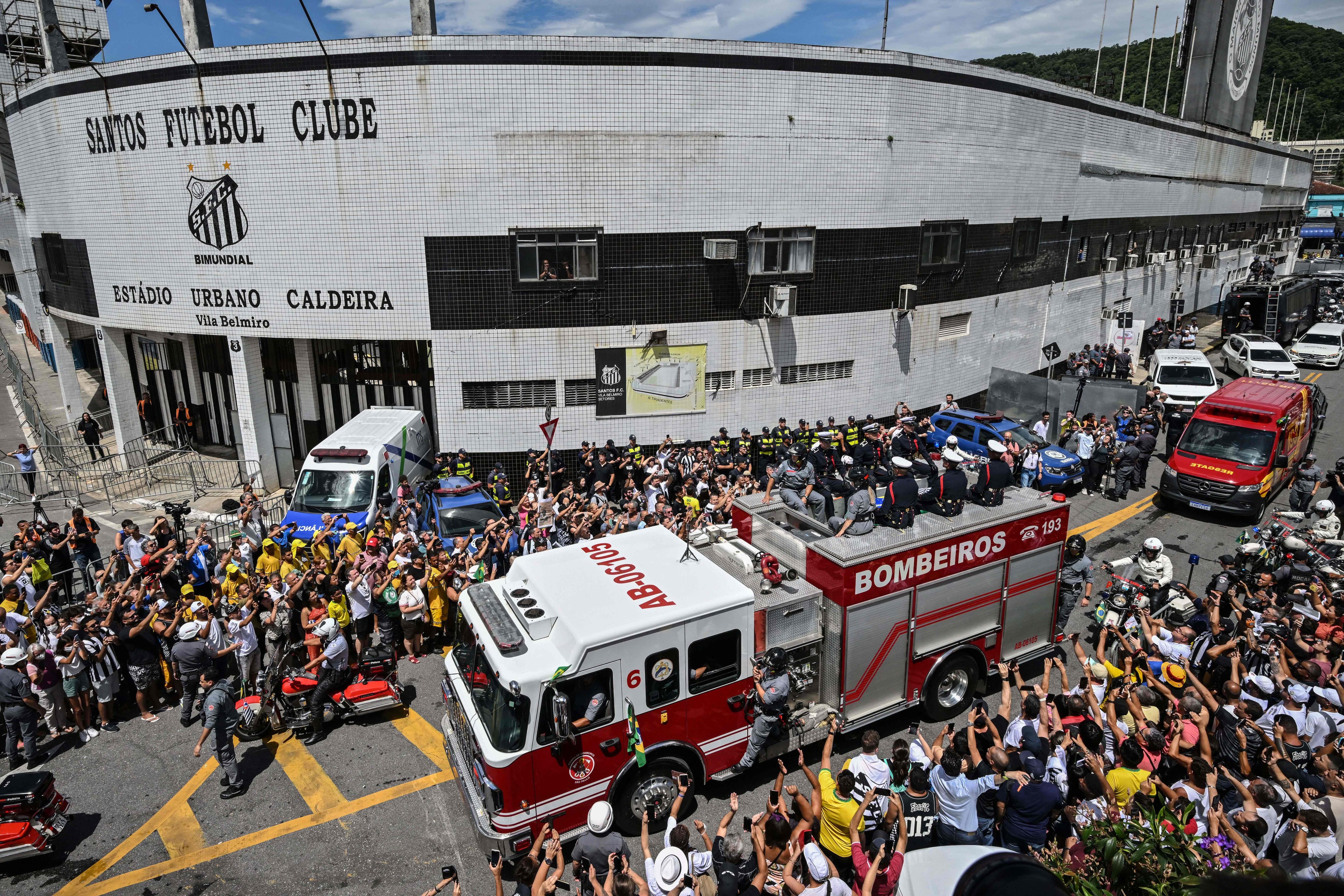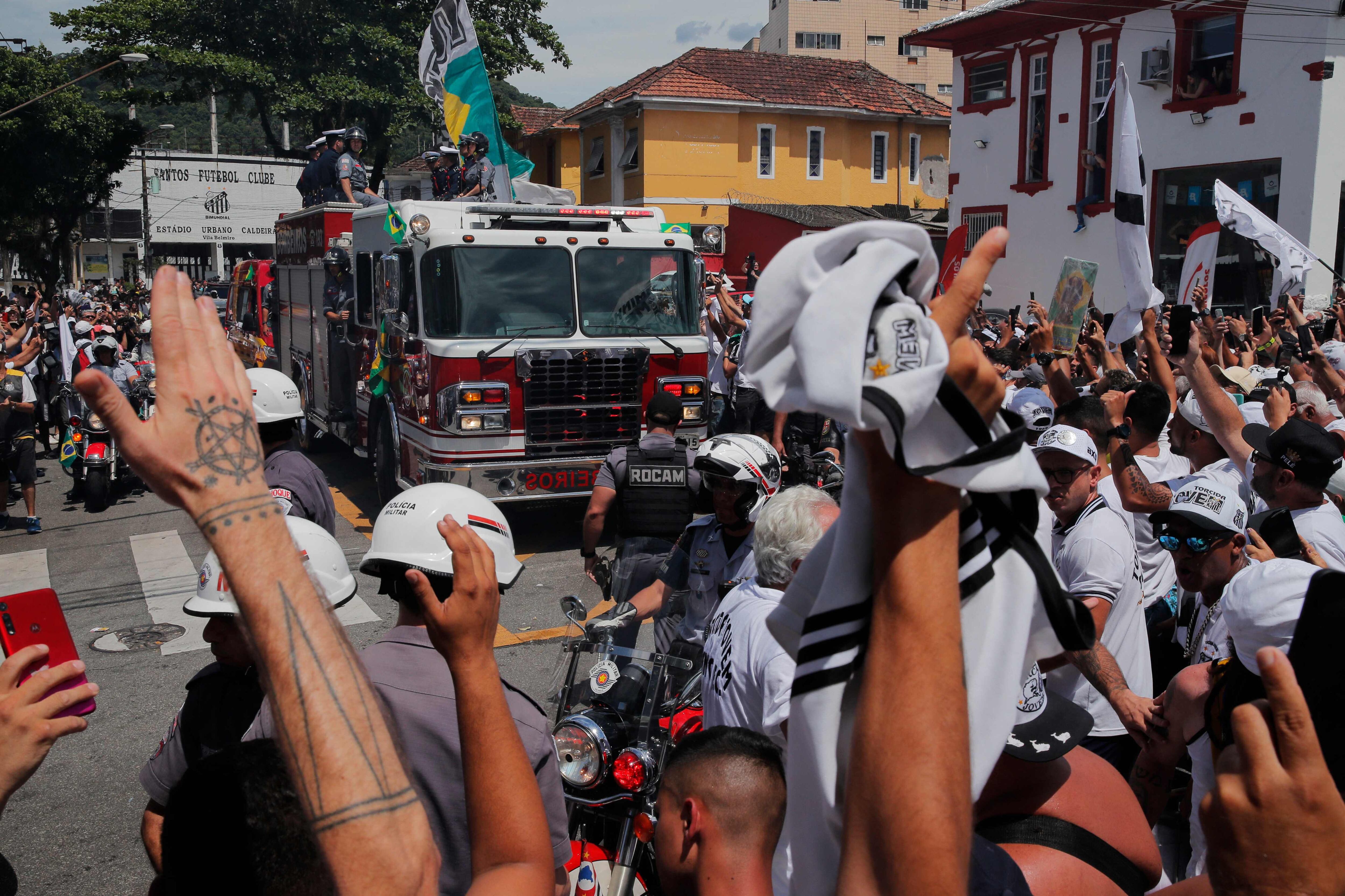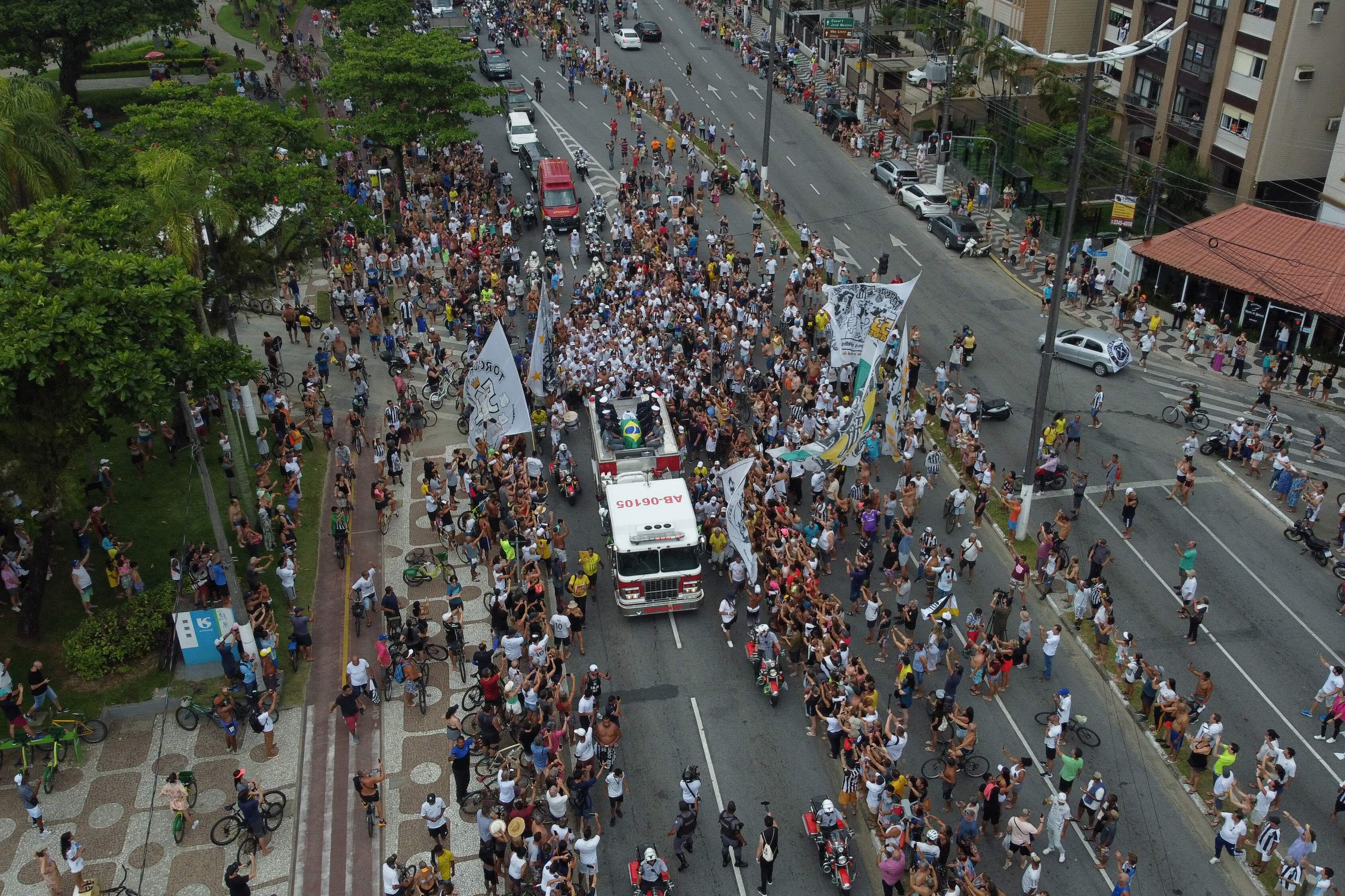 Cubierto con una bandera de Brasil, el féretro negro, custodiado por ocho cadetes de la Policía Militar, era transportado en la parte superior de un camión de bomberos, que recorrerá 7 km por las calles de Santos, ciudad de 430.000 habitantes cerca de Sao Paulo.