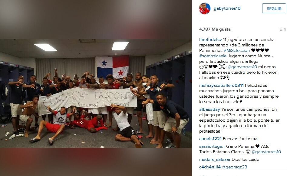 Sentimiento similar el que dejó plasmado el delantero Gabriel Torres, encargado también de subir a su Instagram la foto con una manta con la leyenda: "Concacaf ladrones", además de "Corruptos".