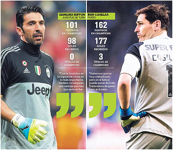Gianluigi Buffon, de 39 años, e Iker Casillas, de 35, podrían tener este martes su último gran duelo, cuando la Juventus reciba al FC Porto en la vuelta de los octavos de final de la Champions, a la 1:45 p. m.