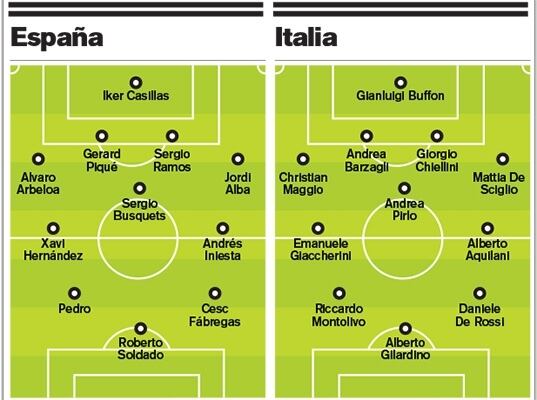 Italia llega al partido con las bajas de dos milaneses, el defensa Ignazio Abate y el atacante estrella Mario Balotelli, de regreso ya a Italia porque ninguno de los dos hubiera estado listo para la final en caso de que venzan a España.
