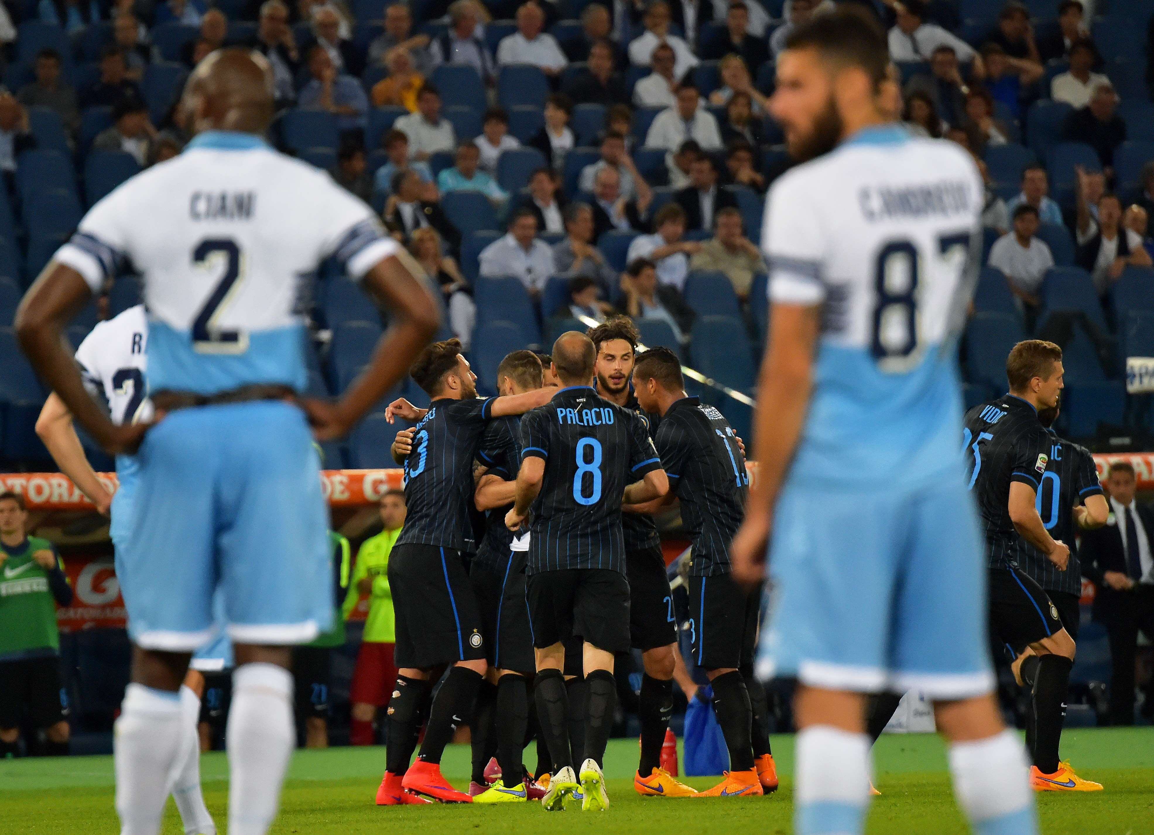 El Lazio, que acabó el partido con nueve jugadores, desperdició la oportunidad de desplazar a su vecina Roma del segundo puesto de la Serie A de Italia al perder 2-1 en casa ante el Inter de Milán por un doblete del brasileño Hernanes, este domingo en la jornada 35.