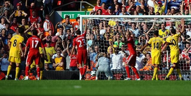 El partido fue volcánico en el último cuarto de hora. El Liverpool jugó incluso algunos minutos con nueve, ya que Daniel Agger se retiró aturdido tras un choque en el 81’ y estuvo en la banda recuperándose cinco minutos. Entró como pudo, pues el Liverpool ya había realizado los tres cambios.