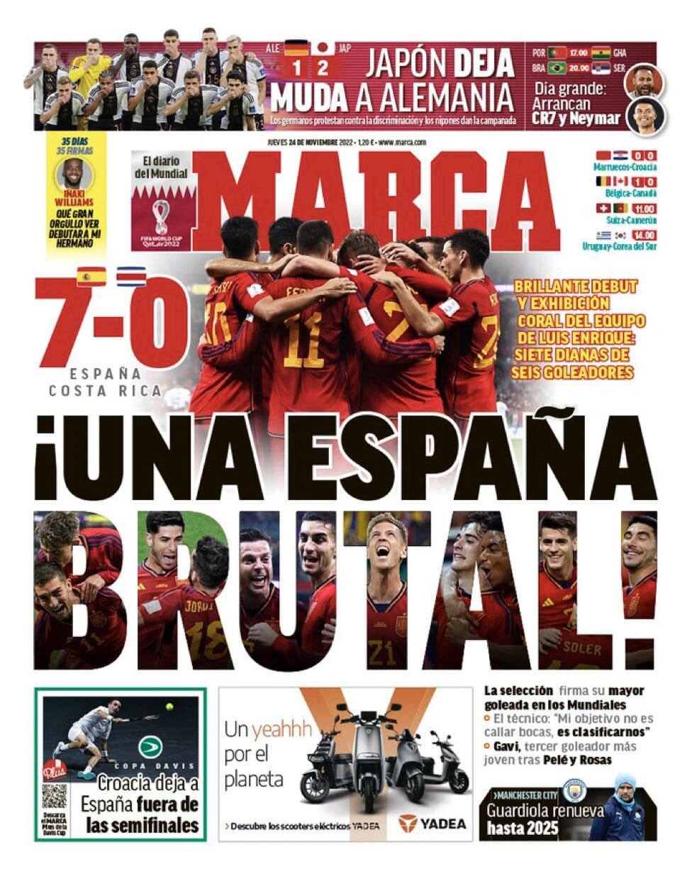 Marca añadió: “Luis Enrique tuvo tiempo para dar reposo a los más señalados por el calendario. Ferran, Gavi, Soler y Morata volvieron a retratar a Costa Rica, un rival que hace imposible calibrar dónde está el límite de España. Siete goles que sonaron a gloria lanzan un aviso al envoltorio del Mundial. Que le pregunten a los argentinos y alemanes si el inicio es importante en un Mundial”.