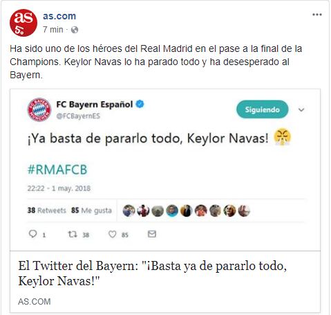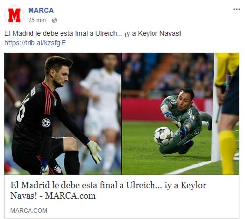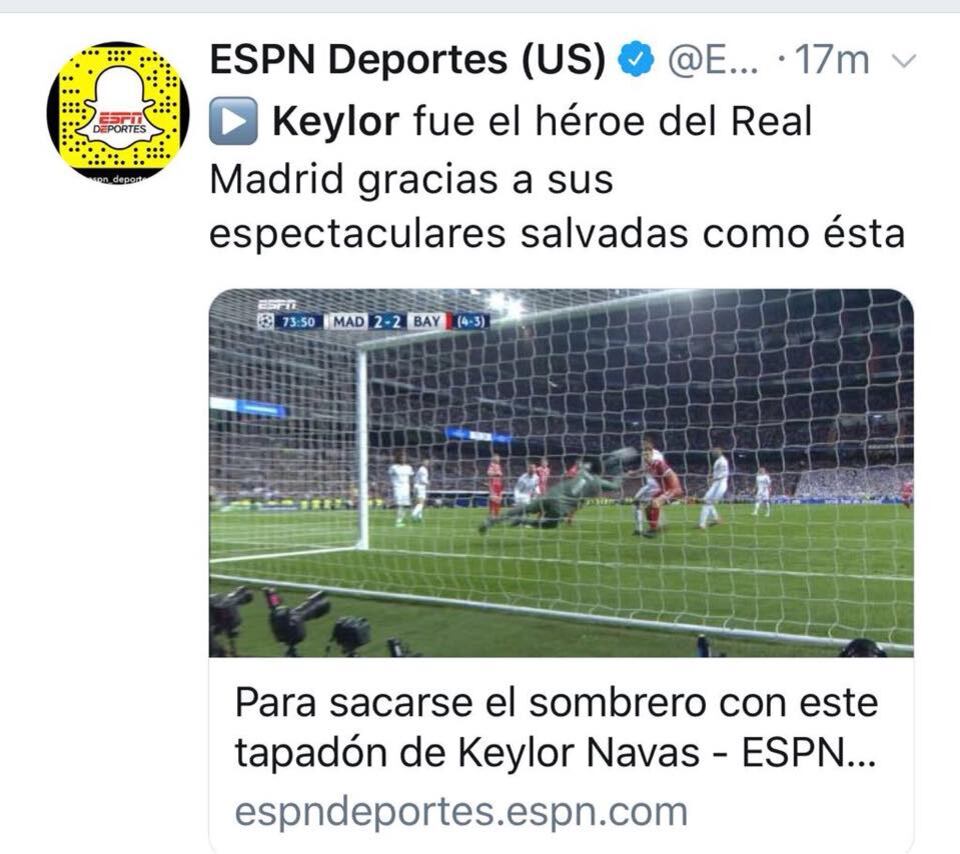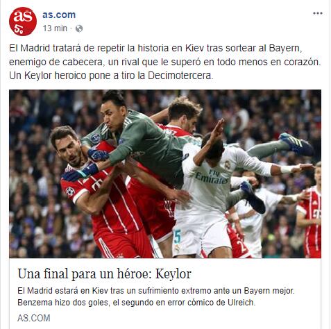 "Los críticos le recordarán el gol de la ida, pero las tres paradas de Keylor a Lewandowski, Alaba y Tolisso son de las que valen finales. La primera fue en un remate cercano del polaco, que se fue sin marcar un gol en 180 minutos. La segunda, a un disparo del lateral que se envenenó tras pegar con Varane y al que respondió en décimas de segundo. Y la tercera a un disparo a quemarropa de Tolisso. En los goles poco pudo hacer. El tico jugará su tercera final consecutiva como titular del Real Madrid y en esta, tiene mucha culpa", reseñó Marca.