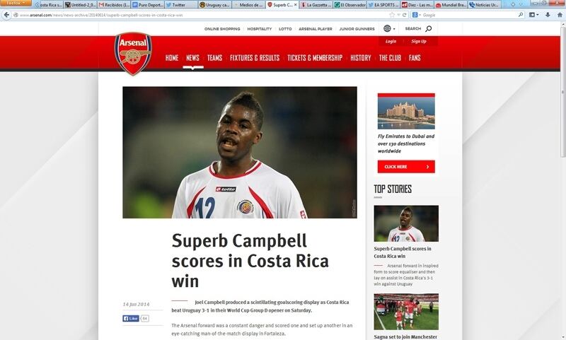 “Un soberbio Campbell anotó en el triunfo de Costa Rica”, así título la página del Arsenal, el conjunto que es dueño de la ficha de Joel Campbell.