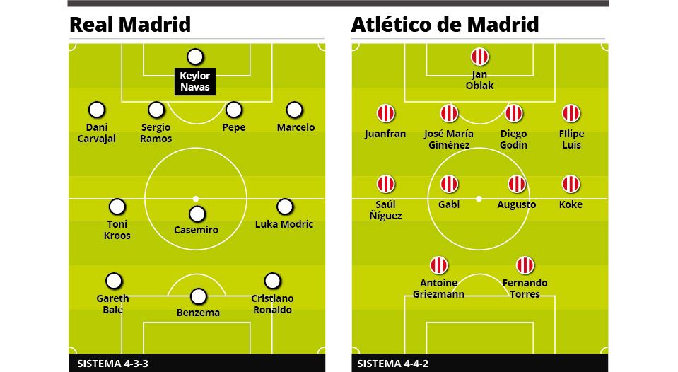El Real Madrid y el Atlético reeditarán la final de la Champions League luego de enfrentarse en 2014. En dos años mucha agua ha pasado bajo el puente y eso queda reseñado en las variantes que presentan ambos equipos para el partido de este sábado (12:45 p. m.).
