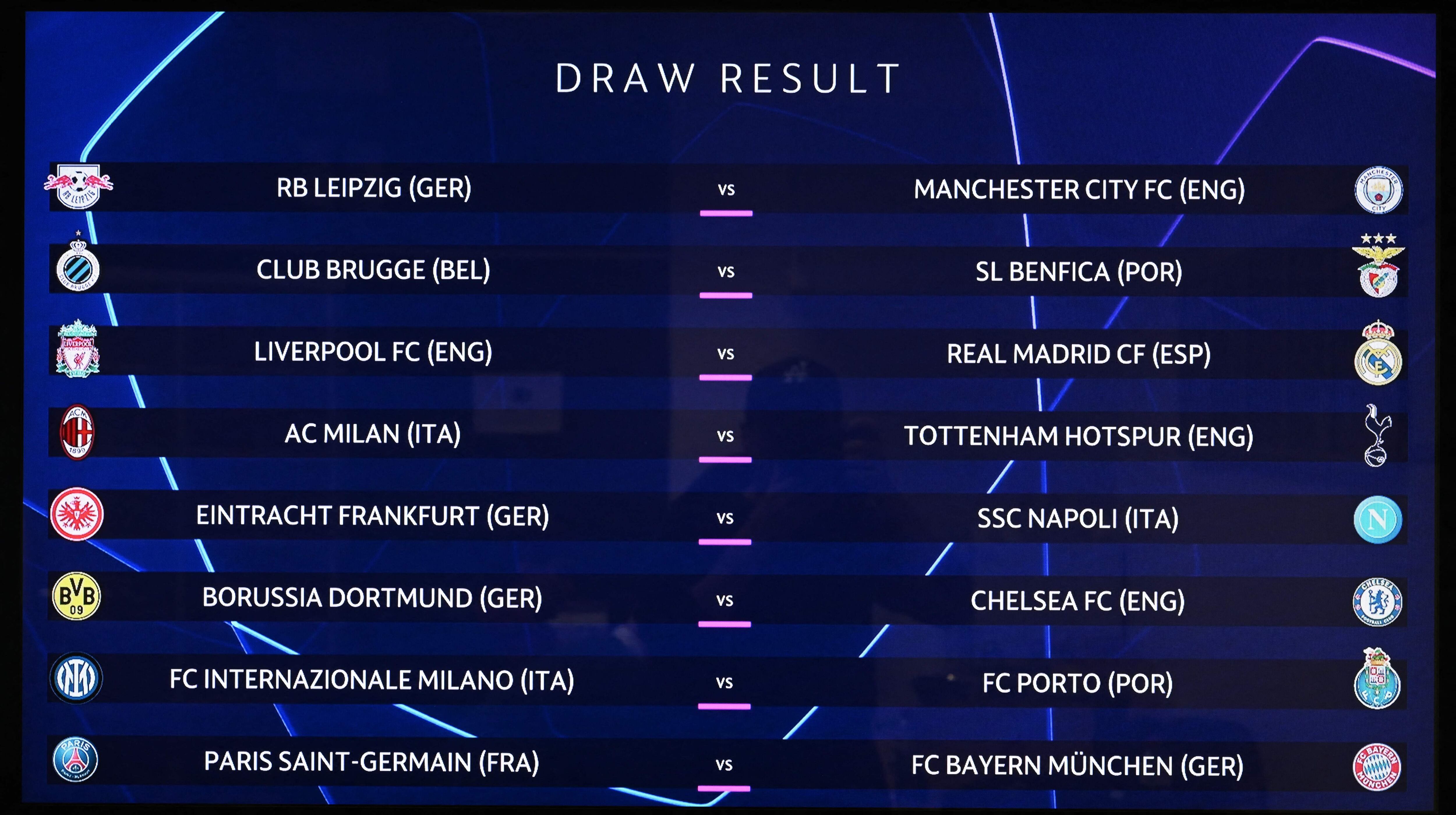 Camino de la final, el 10 de junio en Estambul, los otros duelos de octavos ofrecen cruces entre antiguos vencedores de la Liga de Campeones: el Borussia Dortmund (1997) se medirá Chelsea (2012, 2021) y el Inter de Milán (1964, 1965, 2010) se enfrentará al Oporto (1987, 2004).
