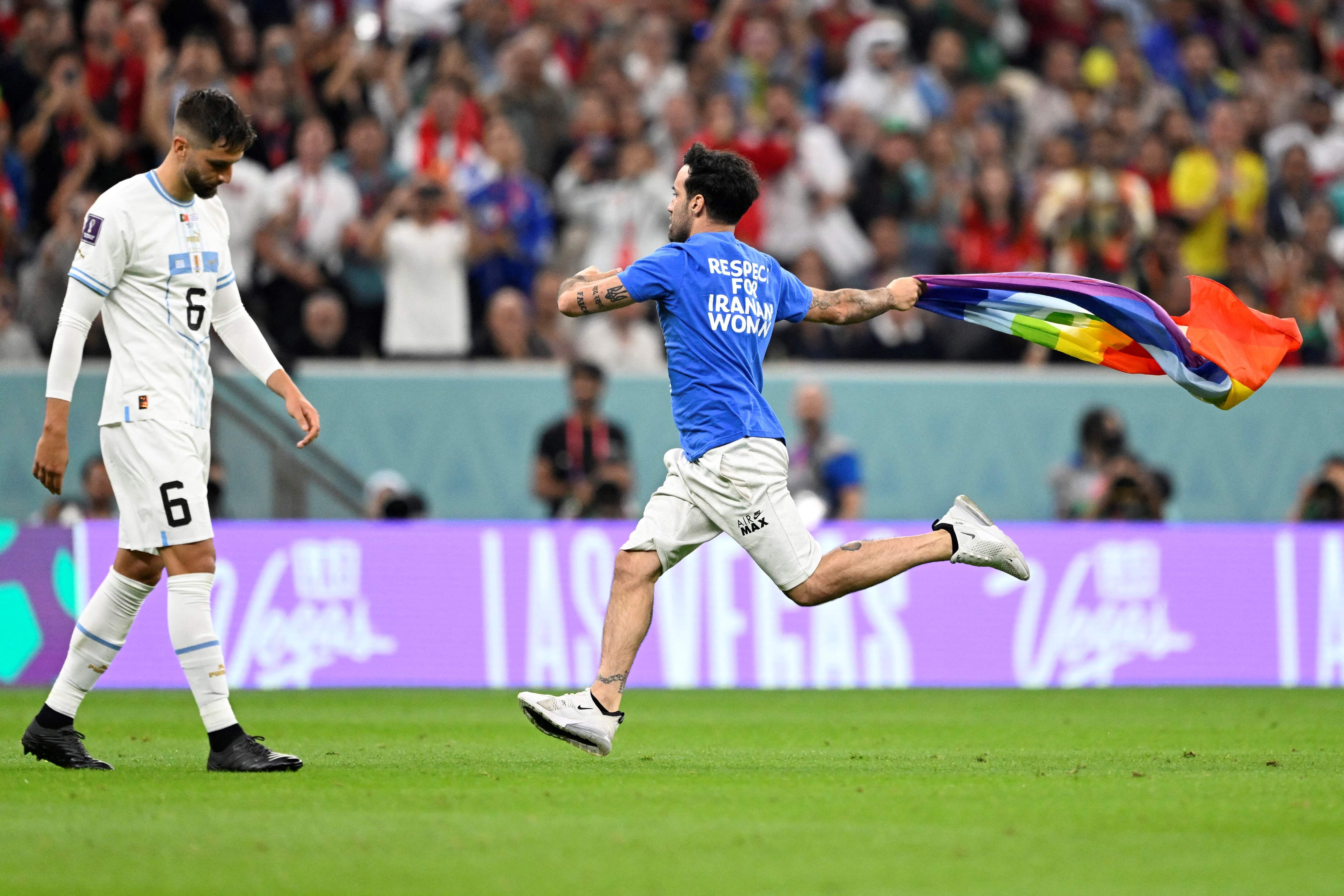 Doha. Un individuo con una bandera arcoíris y una camiseta con un mensaje a favor de las mujeres iraníes y en contra de la invasión rusa en Ucrania entró al césped durante el partido entre Portugal y Uruguay disputado este lunes en el Estadio Lusail, constataron periodistas de la AFP.