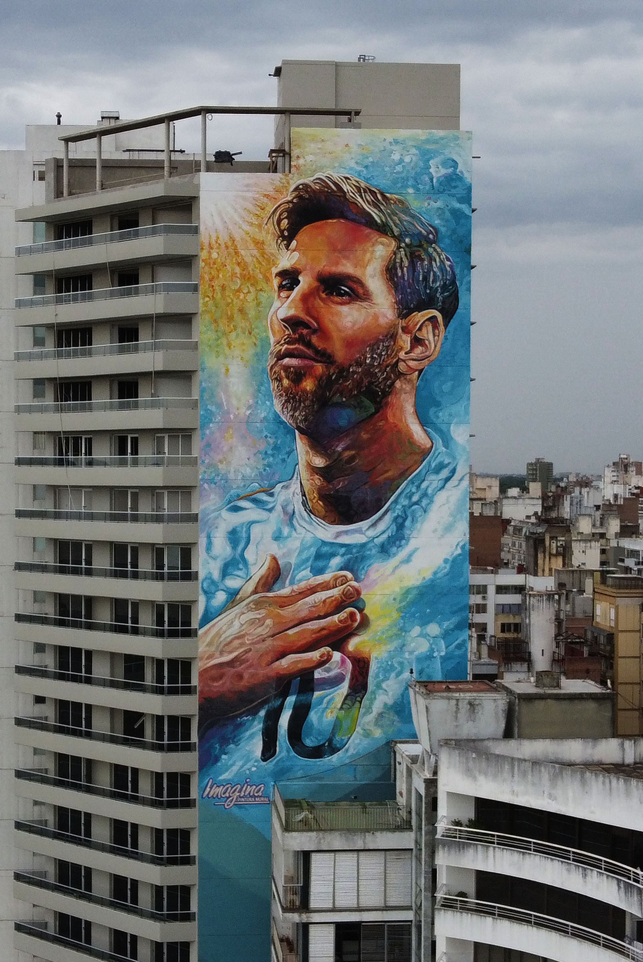 Rosario, Argentina. Una gran mural del astro argentino Lionel Messi fue inaugurado este lunes en un edificio de su natal ciudad de Rosario (al norte), con la camiseta de la Albiceleste, su mirada puesta en el histórico Monumento a la Bandera y la mano derecha en el corazón.