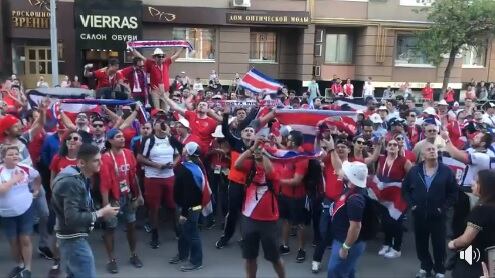 Con el corazón y orgullosos de su bandera, docenas de aficionados costarricenses entonaron el Himno Nacional en las afueras del hotel de concentración de la Selección Nacional en la localidad de Samara, en Rusia.