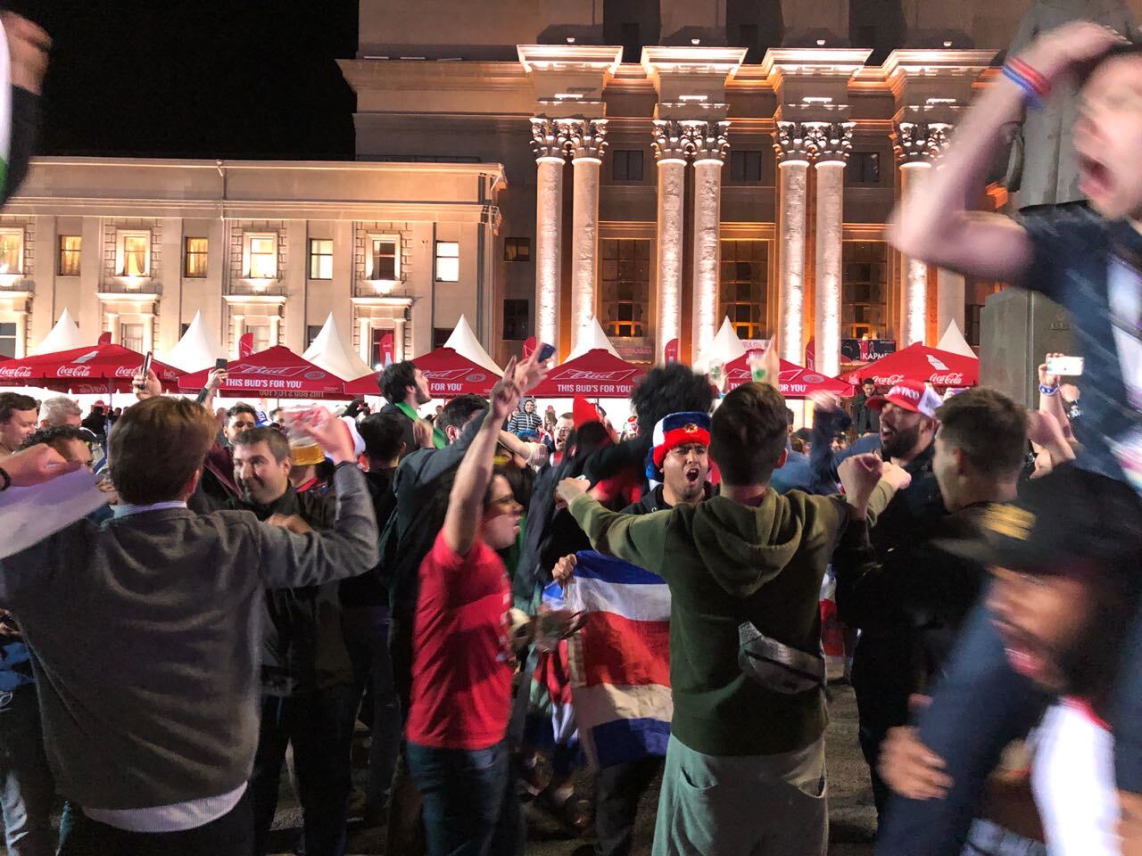 La fiesta se desató, al punto que las autoridades del Fan Fest ya habían apagado la pantalla gigante y ante el ambiente que desarrollaron los costarricenses la volvieron a prender para reflejar lo que se vivía, pero los festejos continuaron y prácticamente culminaron frente al hotel de la sede, esperando con ansiedad el partido.