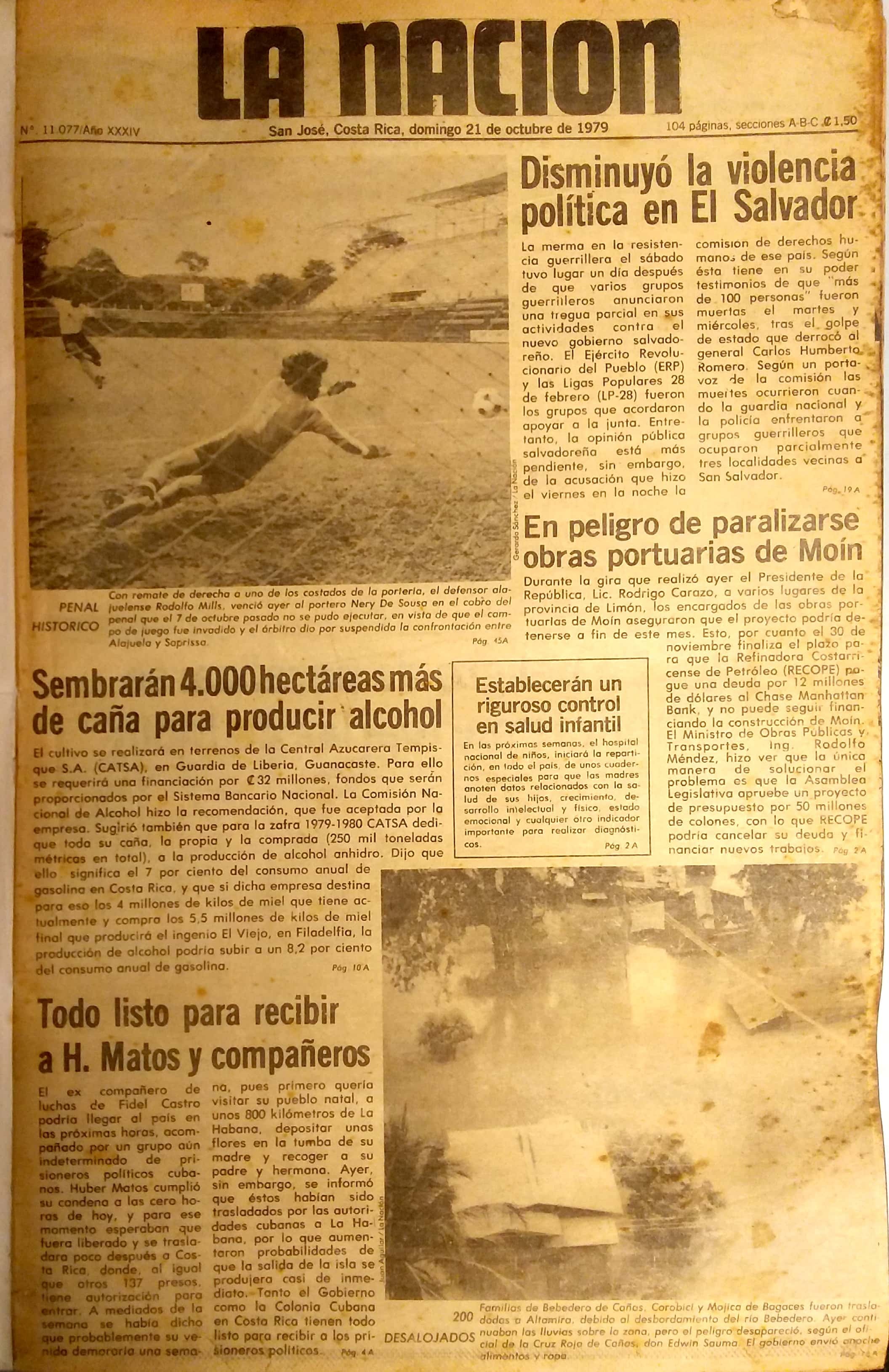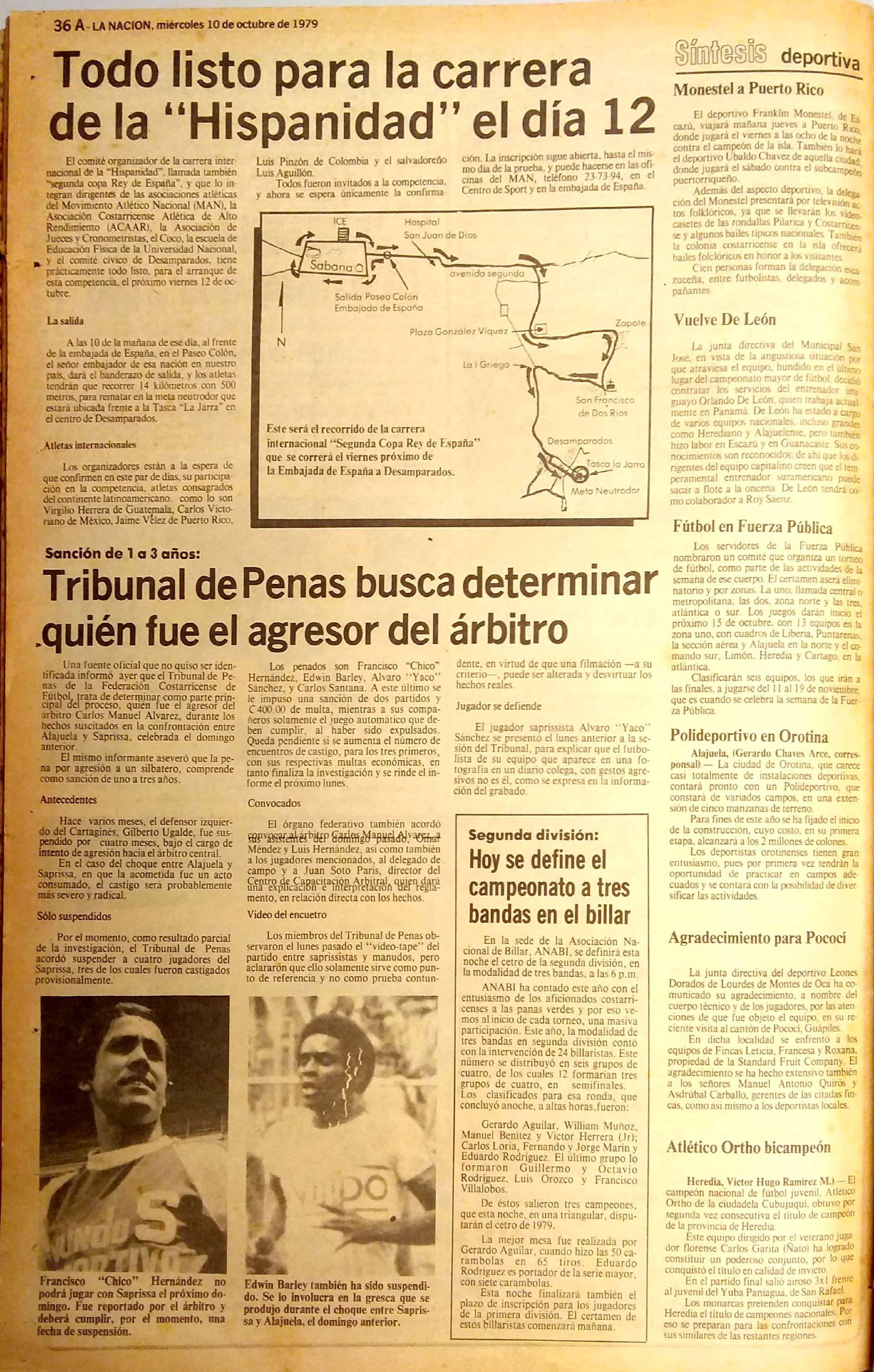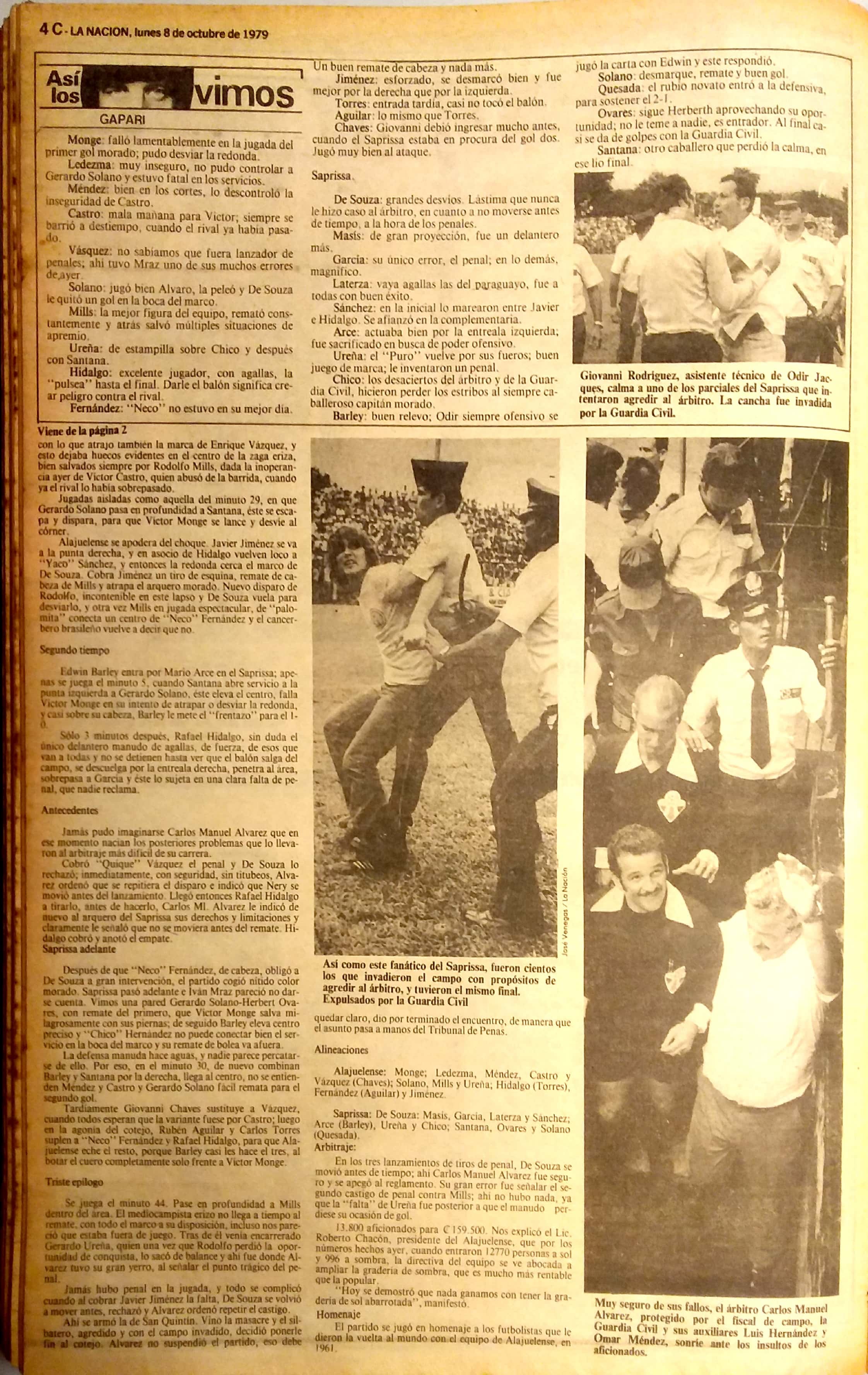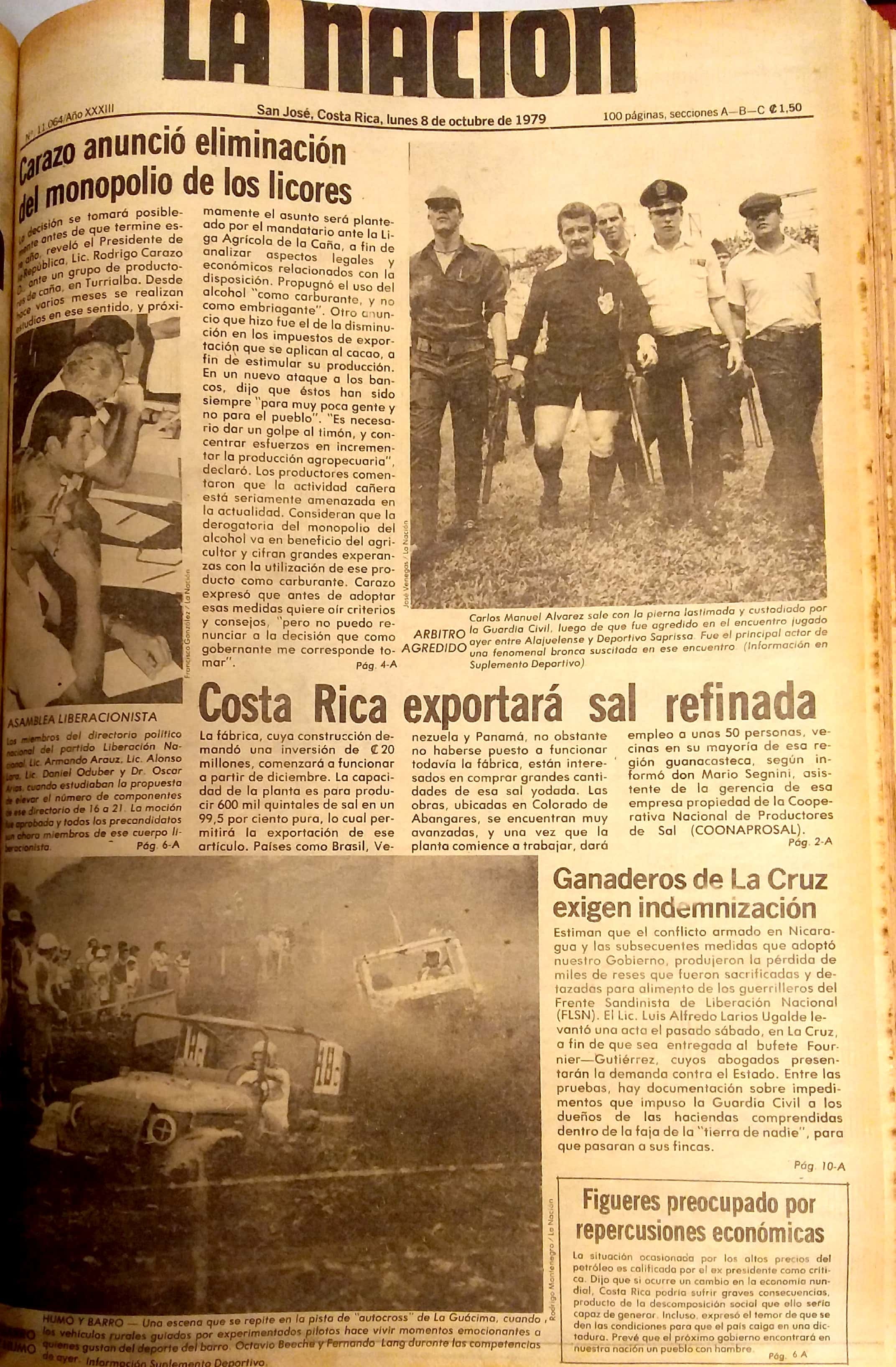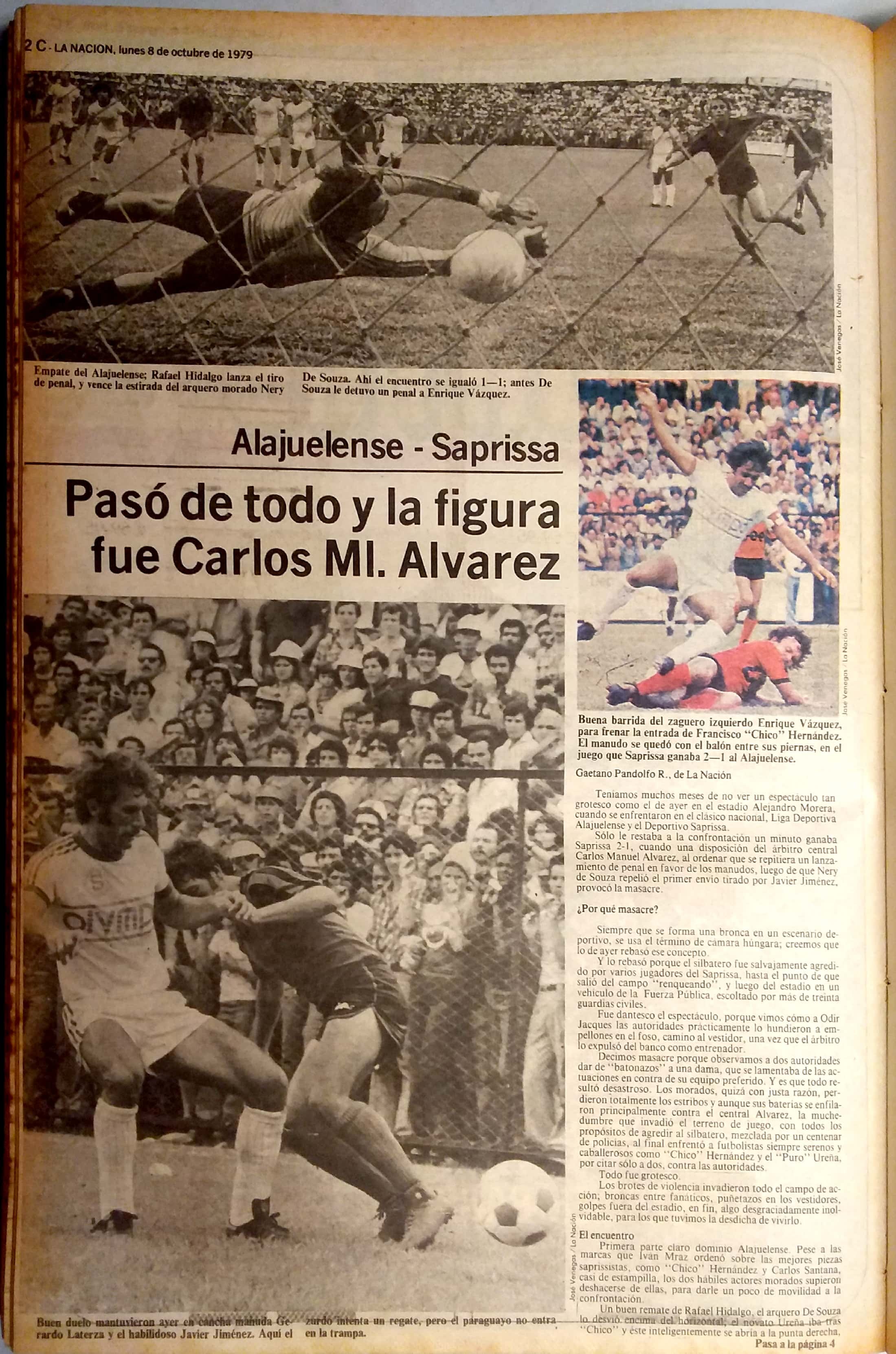 En la portada de La Nación del lunes 8 de octubre de 1979 se publicó una fotografía con el destacado: “Árbitro agredido” y se detalló: Carlos Manuel Álvarez sale con la pierna lastimada y custodiado por la Guardia Civil, luego de que fuera agredido en el encuentro jugado ayer entre Alajuelense y Deportivo Saprissa. Fue el principal actor de una fenomenal bronca suscitada en ese encuentro".
