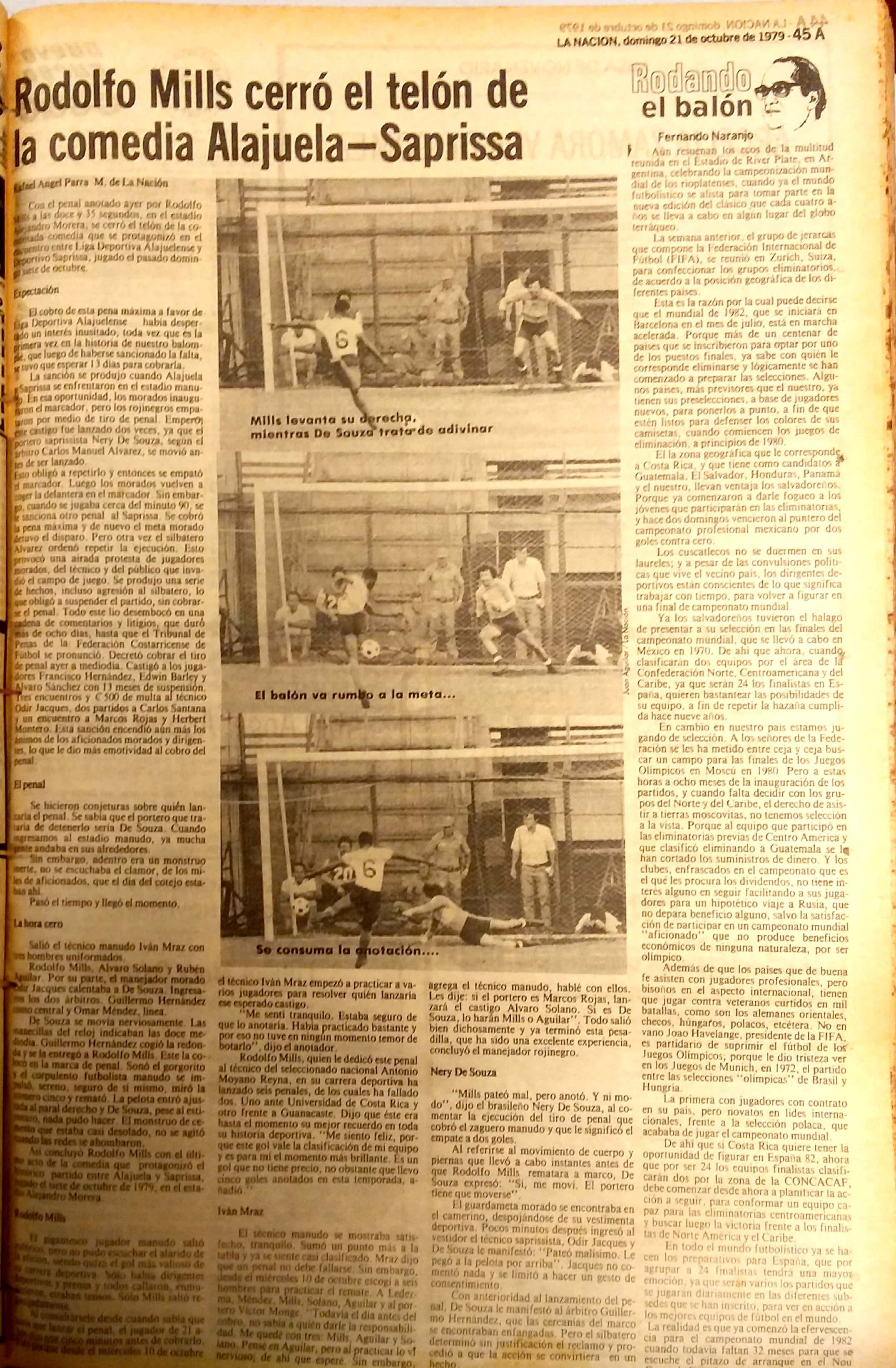 En la sección deportiva, se consignó: “Rodolfo Mills cerró el telón de la comedia Alajuela - Saprissa”.