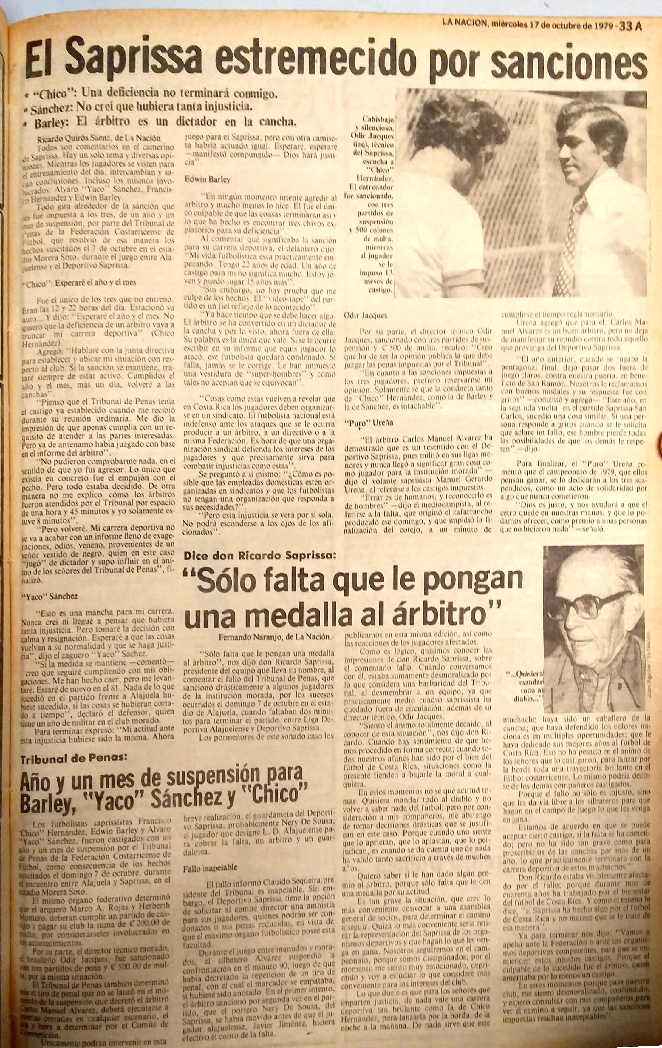 Para el 17 de octubre, La Nación tituló: “El Saprissa estremecido por sanciones”. A los jugadores les habían dictado un castigo de un año y un mes sin jugar y los implicados dieron su versión.