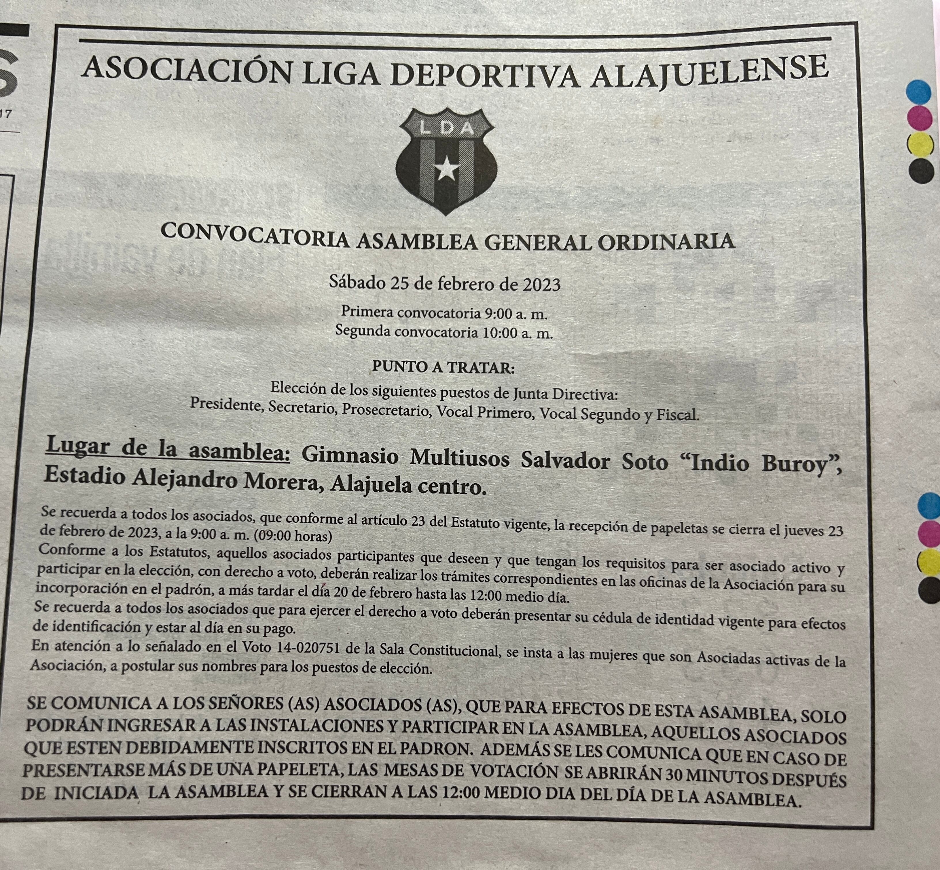 Liga Deportiva Alajuelense hizo la convocatoria oficial para celebrar el próximo 25 de febrero la Asamblea General Ordinaria, con un solo punto a tratar: las elecciones.