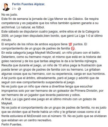 En su cuenta de Twitter, el presidente del Saprissa, Juan Carlos Rojas, lamentó lo ocurrido en ese clásico de liga menor y escribió: “Absolutamente repugnante e inaceptable el que padres de familia insulten a niños de un equipo rival”.