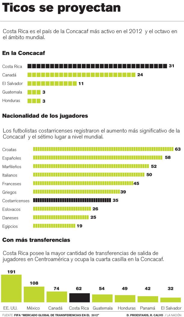 Por nacionalidad, los futbolistas ticos registraron el aumento más importante de la Concacaf –y el sétimo puesto mundial–, con 35 pases más que en el 2011, dentro del mercado de transferencias.