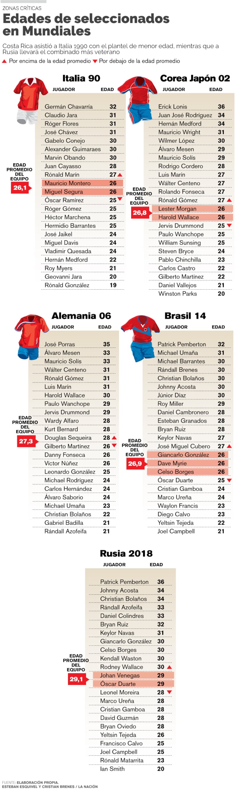 El promedio de edad del grupo de futbolistas convocados por Óscar Ramírez es de 29 años, mientras que para Brasil 2014, Alemania 2006 y Corea-Japón 2002 fue de 27 y para Italia 1990 fue de 26, el menor hasta el momento para la Sele en una justa mundialista.
