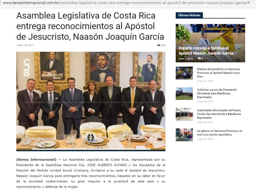 Incluso, el líder religioso recibió un homenaje en la Asamblea Legislativa de Costa Rica el 11 de enero del 2017.