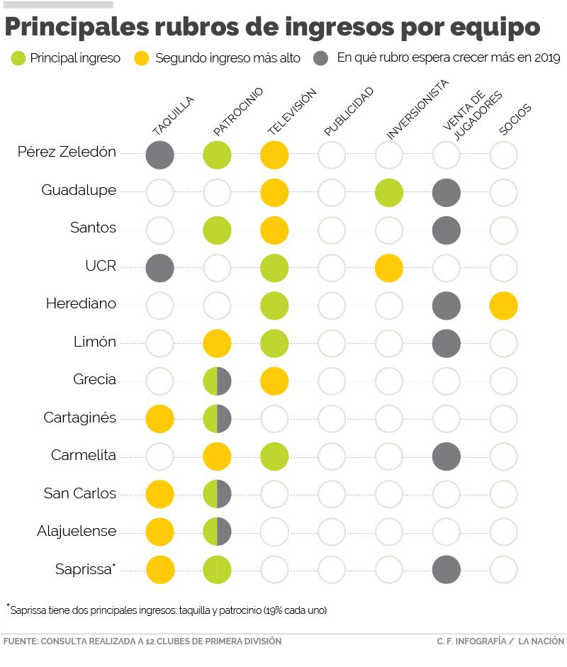 Ante consulta de La Nación, los 12 equipos de Primera revelaron cuáles son los dos primeros rubros con los que ingresan dinero a sus arcas. Se les pidió elegir entre taquillas, patrocinadores, televisión, publicidad, inversionistas, venta de jugadores y socios.